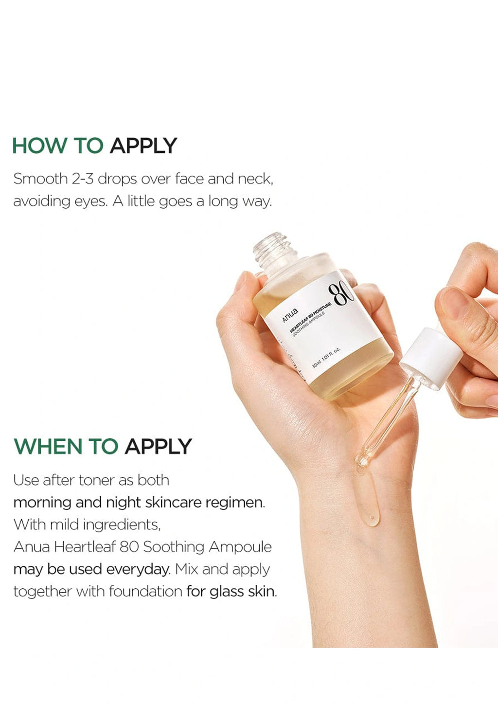 5. Follow up with your regular skincare routine, such as a moisturizer or sunscreen, depending on your needs. The Anua Heartleaf Soothing Ampoule helps prepare your skin to absorb these subsequent products more effectively, making your skincare routine even more beneficial.