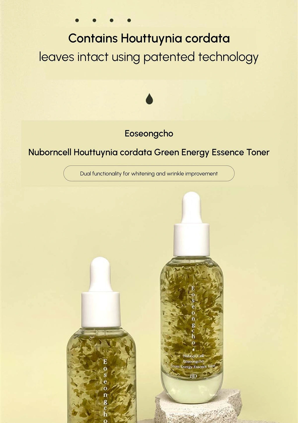 Introducing Blanc Dubu Nuborn Cell Eoseongcho aka Houttuynia Cordata Green Energy Essence Toner, a crafted Skincare solution that combines advanced technology with natural ingredients to elevate your Skincare routine. Experience the power of patented technology that preserves a concentration of 50,000ppm Houttuynia cordata leaves intact in every drop of this essence toner. The advanced method of plant softening technology not only ensures the integrity of the leaves, allowing you to benefit from the full potential of this herbal ingredient but also makes sure they melt upon gently massaging on your skin. Bid farewell to dry skin with a transformative toning experience.