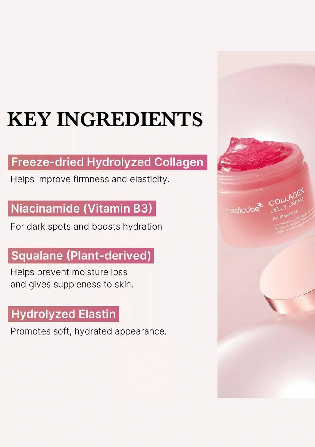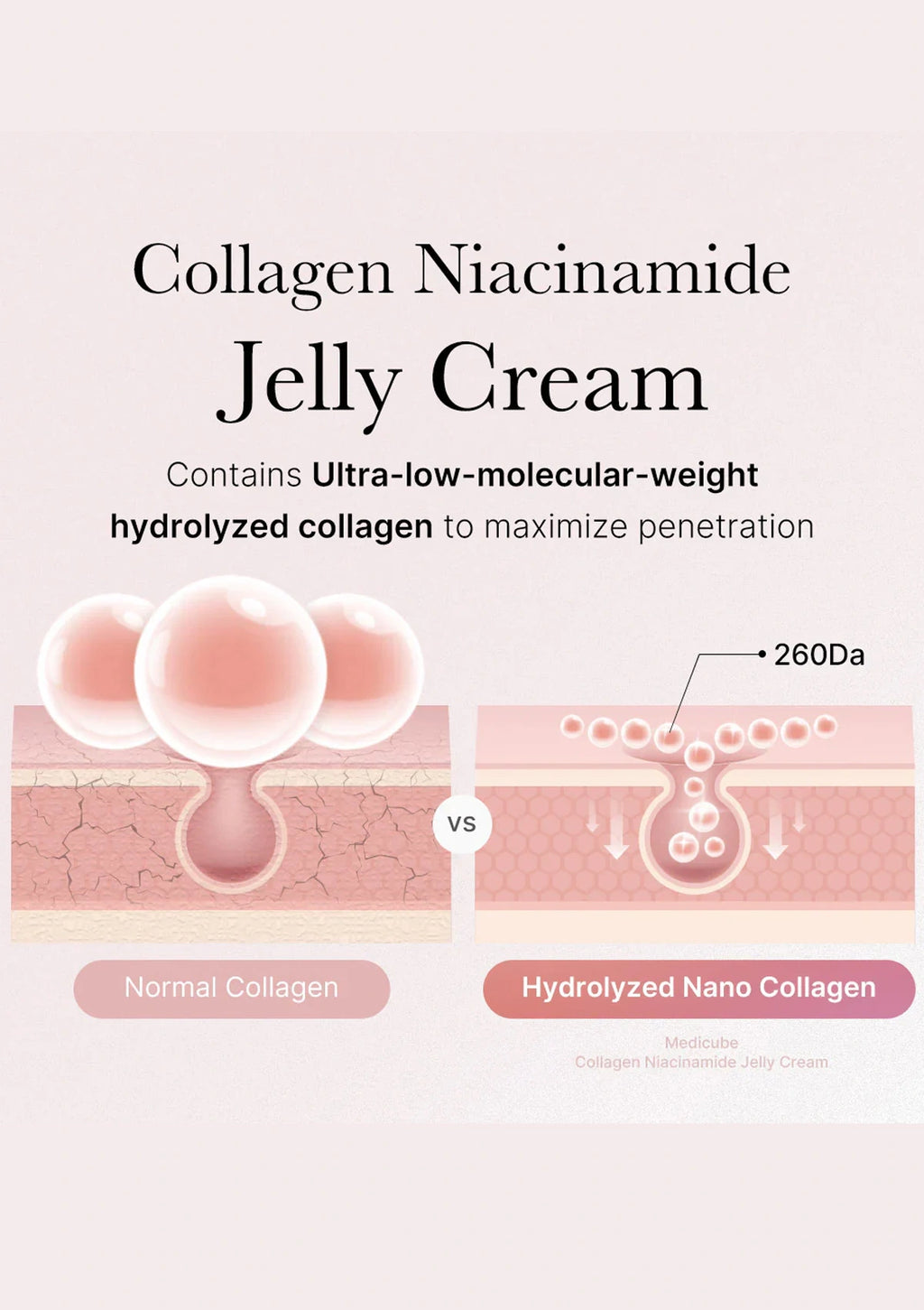 Medicube Collagen Jelly Cream is a transparent, lightweight moisturizer that delivers a glowing, youthful complexion. Infused with freeze-dried hydrolyzed collagen, this cream works to enhance skin elasticity, helping to reduce the appearance of fine lines and wrinkles. The unique jelly texture provides a refreshing sensation and creates a "Korean Glass Glow," leaving the skin with a polished, luminous finish. Niacinamide brightens the skin and evens out skin tone, further enhancing the skin's overall radiance, making it look naturally radiant and refreshed.