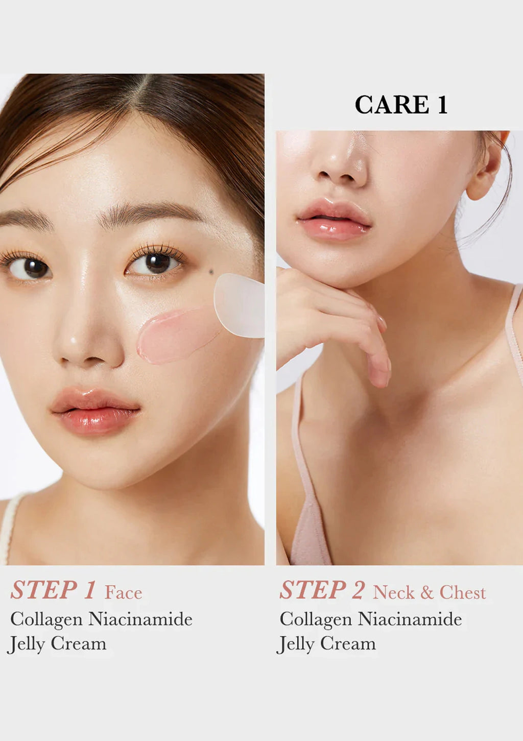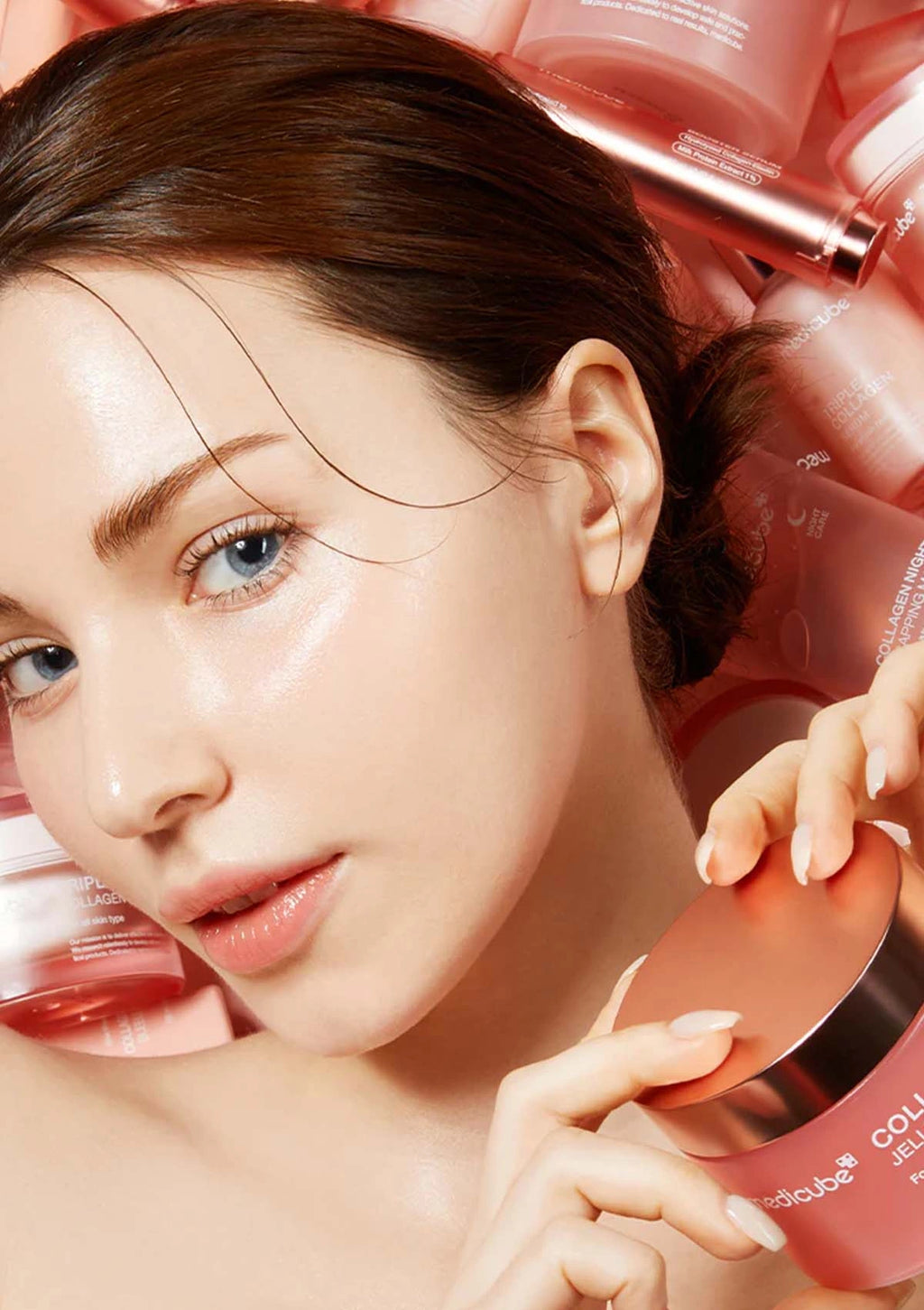 3. Take a quarter-sized amount of the Medicube Collagen Jelly Cream and apply it evenly to your face and décolletage (neck and chest).