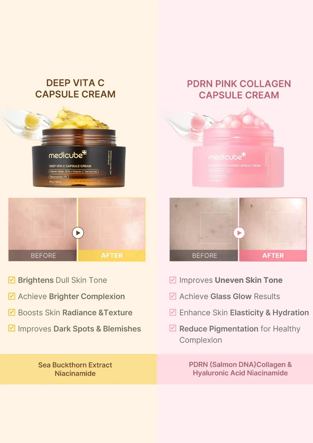 The Deep Vita C Capsule Cream is a dual-texture skincare solution designed to brighten uneven skin tone and spots, leaving skin radiant and even-toned. It features a Vitamin Capsule cream with 50% Sea Buckthorn Extract, 5% Niacinamide, and Pure Vitamin C, combined with a transparent gel infused with Ferulic Acid, Vitamin E, Q, and P for hydration and glow. Its light texture allows customization according to skin type, ensuring a stable, soothing blend that absorbs easily for everyday use. Suitable for all skin types including combination, dry, normal, oily, and sensitive.
