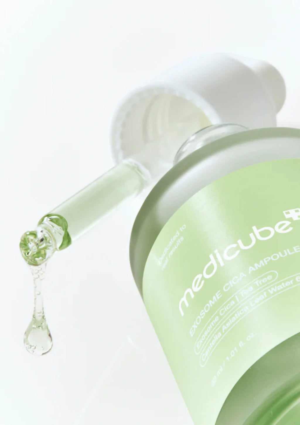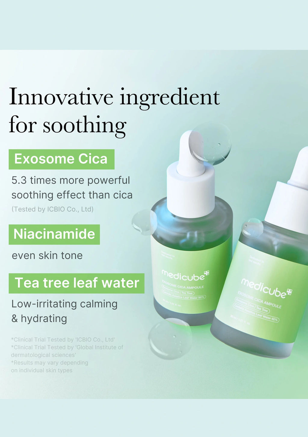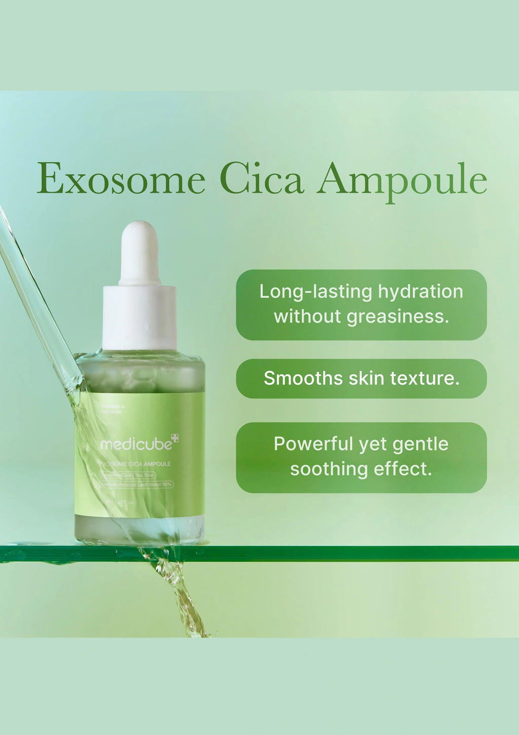 Medicube Exosome Cica Calming Ampoule is a potent skin-soothing and brightening solution enriched with 12 types of Cica ingredients and 2% Niacinamide. It effectively calms irritated skin, brightens dark spots, and improves overall skin texture. Formulated with advanced Exosome Cica, which is 5.3 times stronger than regular Cica, and nano-sized for deep absorption, it quickly delivers intense hydration and relief.