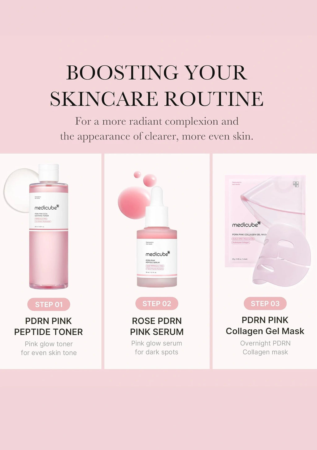 Medicube PDRN Pink Cica Soothing Toner is a revitalizing skincare product formulated with Salmon PDRN, which is structurally similar to human skin, helping to improve dullness and restore radiance. This toner works as a toning repair system, offering skin regeneration and brightening benefits. The PDRN stimulates collagen production, aiding in skin repair and regeneration for healthier skin.