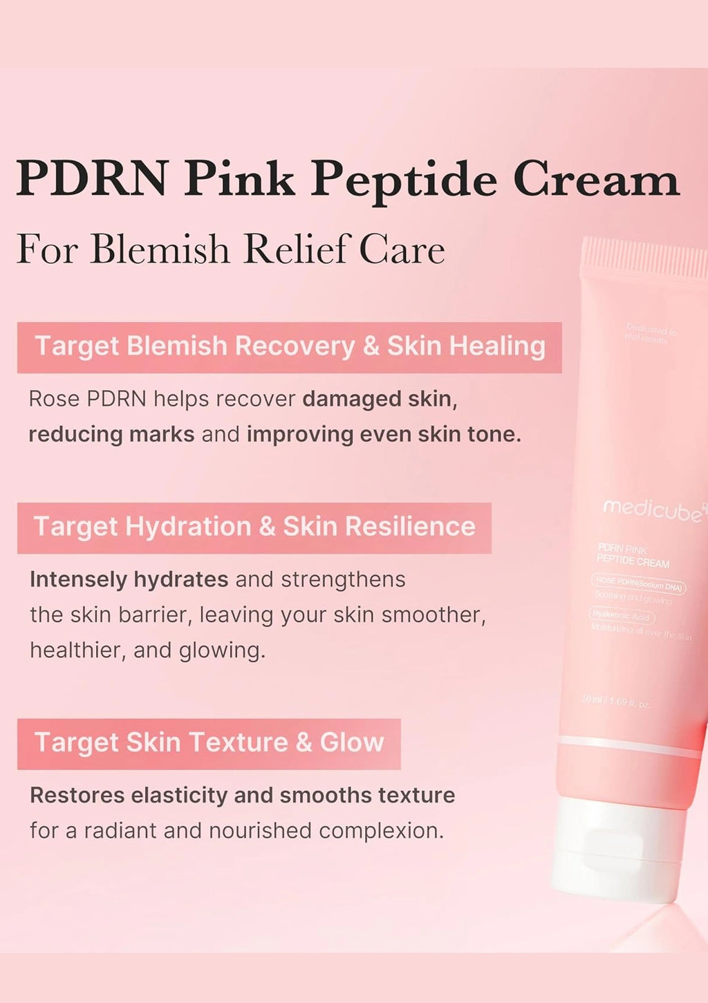 Medicube PDRN Pink Hyaluronic Moisturizing Cream is formulated with Niacinamide and Salmon PDRN, offering a targeted solution for blemishes and skin hydration. After two weeks of use, it helps to reduce blemishes while improving skin tone and texture. This cream works by strengthening the skin barrier to not only address current blemishes but also prevent future breakouts.