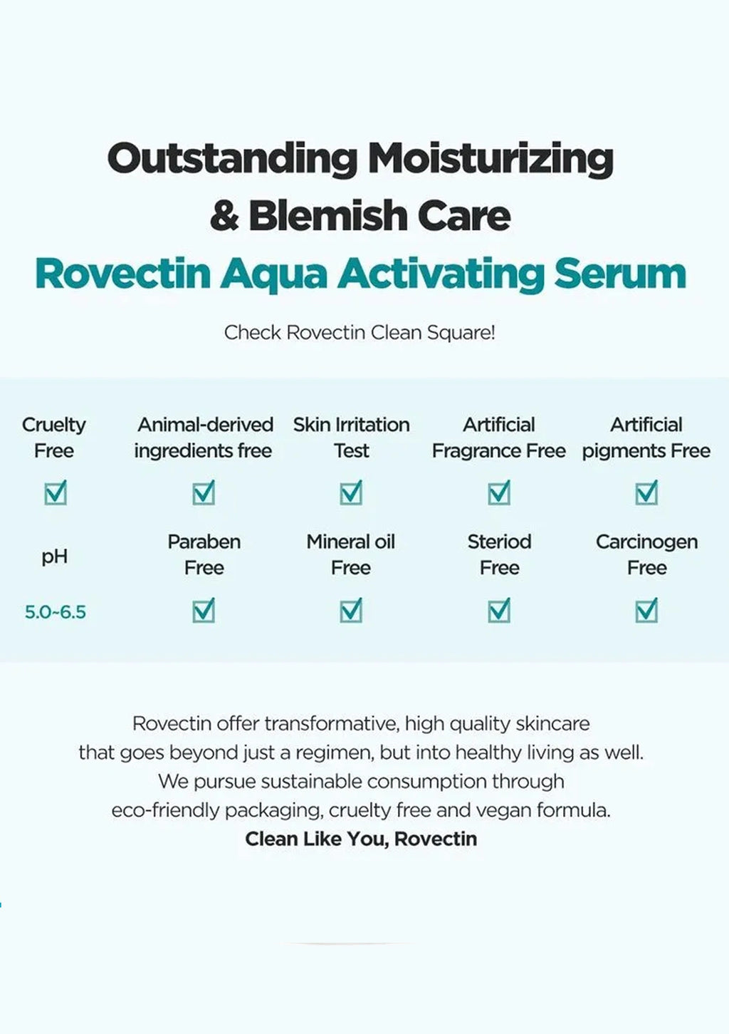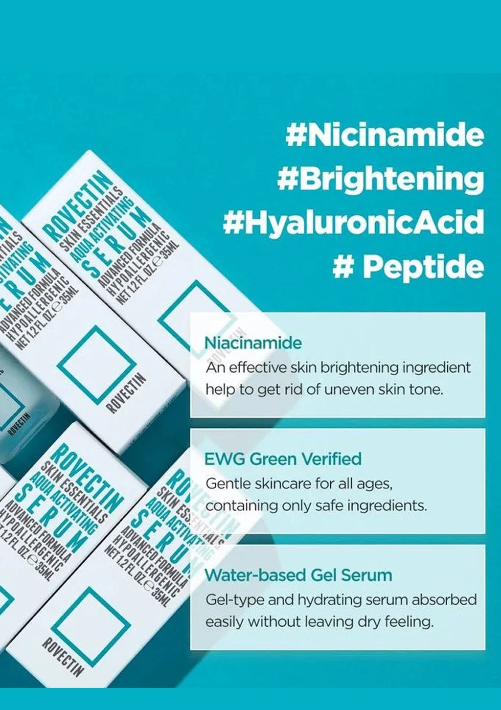 Rovectin Aqua Activating Serum Aqua Cell Activator combines hyaluronic acid, trehalose, and Vitamin E to hydrate and firm skin. Niacinamide is a nutrient that restores skin by helping to improve uneven skin tone, smooth fine lines, and strengthen a weakened skin surface. Peptides, the tiny proteins and active molecules from collagen, provide significant anti-aging benefits.