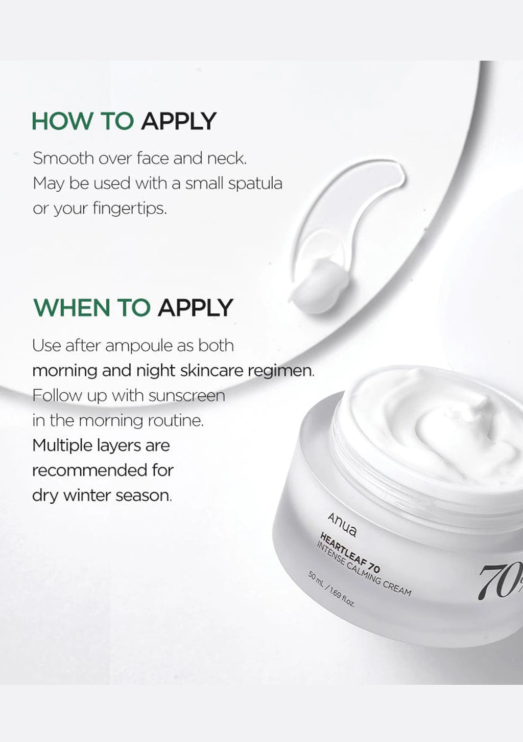 5. Incorporate the Anua Heartleaf Intense Calming Cream into your daily skincare routine. Use it both in the morning and evening after cleansing and applying any serums or essences. Follow up with sunscreen during the day if you're going outside.