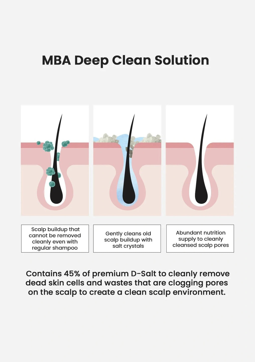 1. Use the MBA Salt Scrub Shampoo 2-3 days a week to exfoliate your scalp and remove the dead skin cells and impurities that have gathered there.