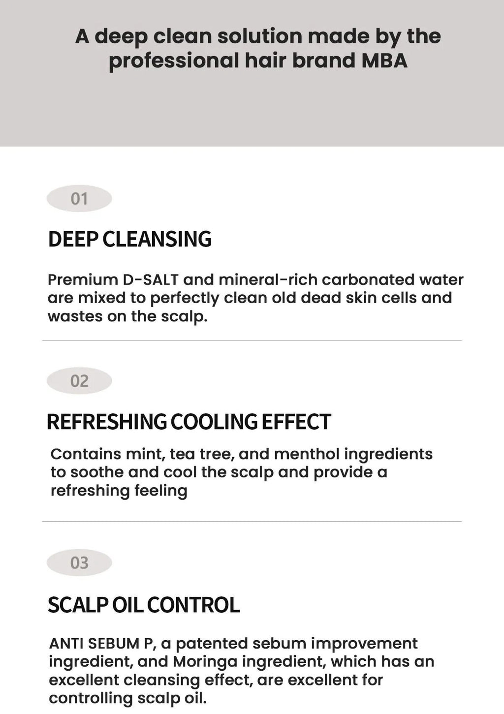It contains mint, tea tree, and methanol ingredients that soothe the scalp and provide a refreshing and cooling sensation. It contains Anti Sebum P - a patented sebum improvement ingredient - and Moringa that have an excellent cleansing effect. It also aids with controlling scalp oil.