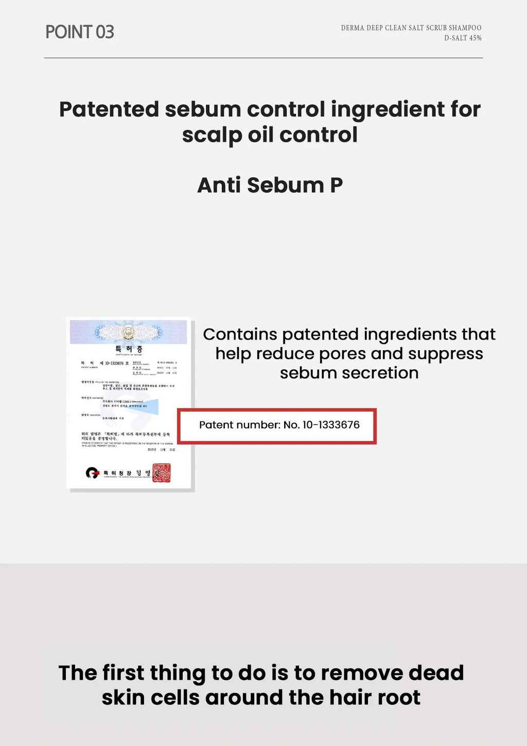 The shampoo contains 350,000ppm of Hanju gold salt which is refined from the deep and clean water from the East Sea, and 100,000ppm of Australian Sea Salt which is harvested from the Antarctic Sea. They help activate the turnover cycle, and it forms a protective film on the skin to give it a shine. It helps activate blood circulation.
