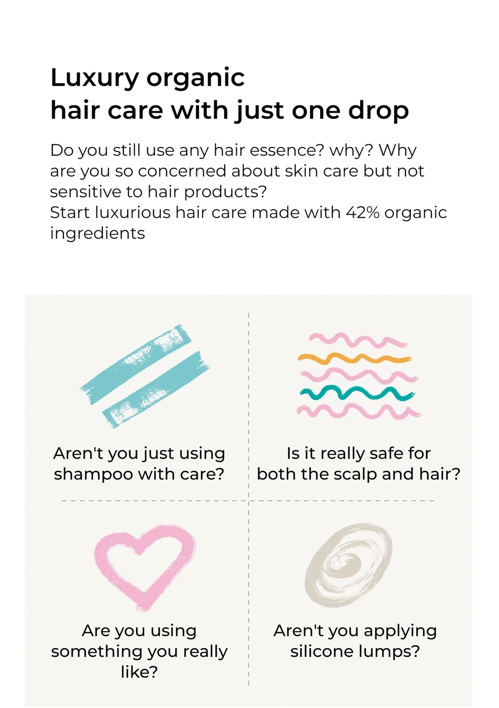 Hair Syrup's formula includes nourishing ingredients like camellia seed oil, rosehip, green tea, coconut, jasmine, strawberry, apples and more, all carefully selected to promote healthy hair growth and provide deep hydration. Whether used daily as a hair essence after shampooing or for special scalp spa treatments mixed with shampoo, Hair Syrup offers a luxurious experience combining organic ingredients' benefits with a delightful scent profile developed by renowned perfumers.