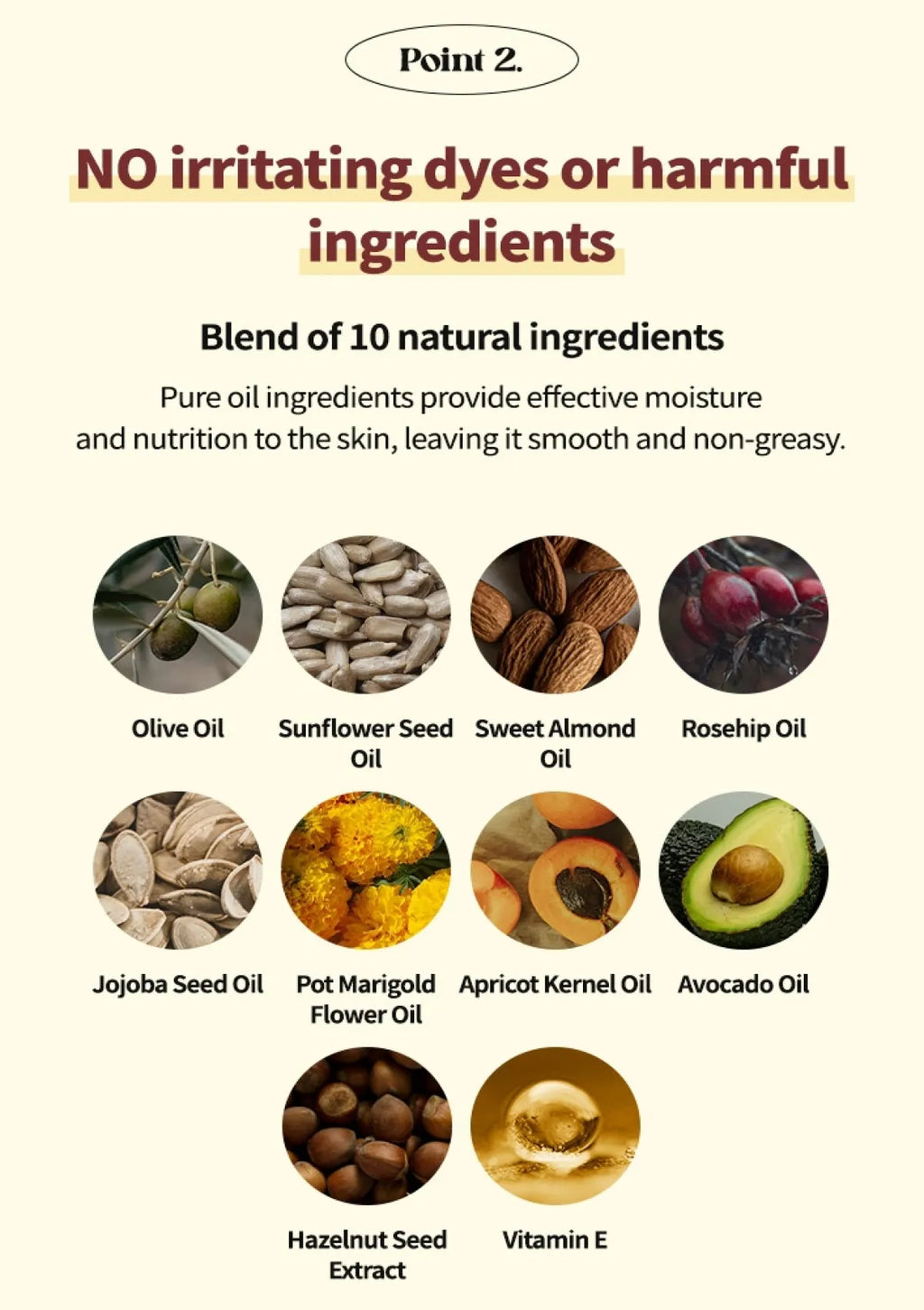 Olea Europaea (Olive) Fruit Oil, Helianthus Annuus (Sunflower) Seed Oil, Corylus Avellana (Hazelnut) Seed Extract, Prunus Amygdalus Dulci (Sweet Almond) Oil, Rosa Canina Flower Oil, Simmondsia Chinensis (Jojoba) Seed Oil, Calendula Officinalis Flower Oil, Prunus Armeniaca (Apricot) Kernel Oil, Persea Gratissima (Avocado) Oil, Tocopheryl Ace Tate, Fragrance.