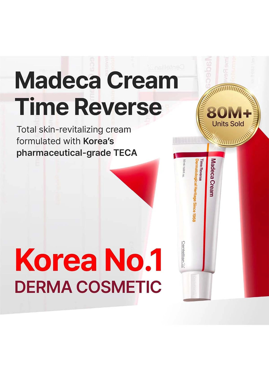 The Centellian24 Madeca Cream Time Reverse is a high-performance Korean anti-aging cream designed to deeply hydrate, soothe, and strengthen your skin barrier. This rich yet fast-absorbing formula is powered by a concentrated blend of Centella Asiatica extracts and patented Active-TECA technology, delivering nourishing nutrients deep into the skin to improve elasticity, tone, and radiance. Clinical tests show it helps reduce the appearance of fine lines, wrinkles, sagging, and dullness while providing lasting moisture without stickiness, making it an ideal choice for those seeking visibly smoother and firmer skin.
