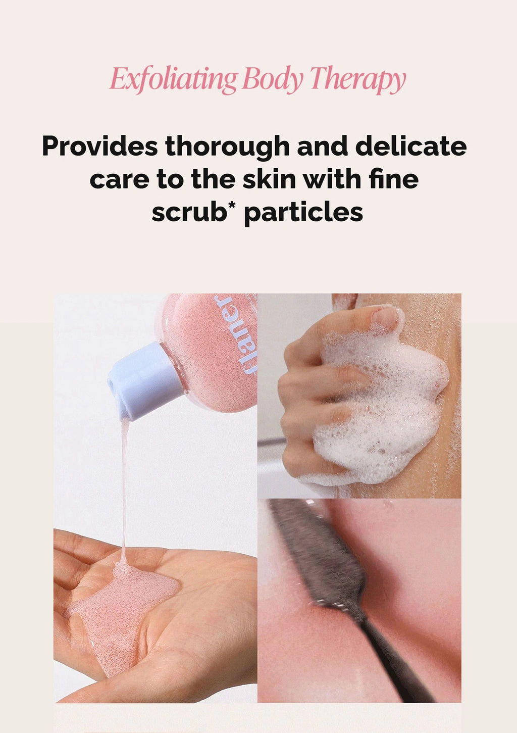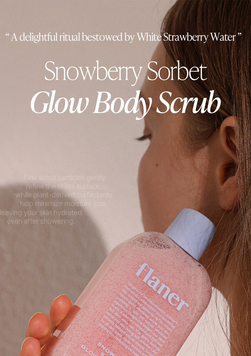 Step 2: Exfoliate (2-3 times a week) Apply Flaner Snowberry Sorbet Glow Body Scrub to exfoliate dead skin cells and smooth rough areas like elbows, knees, and heels.