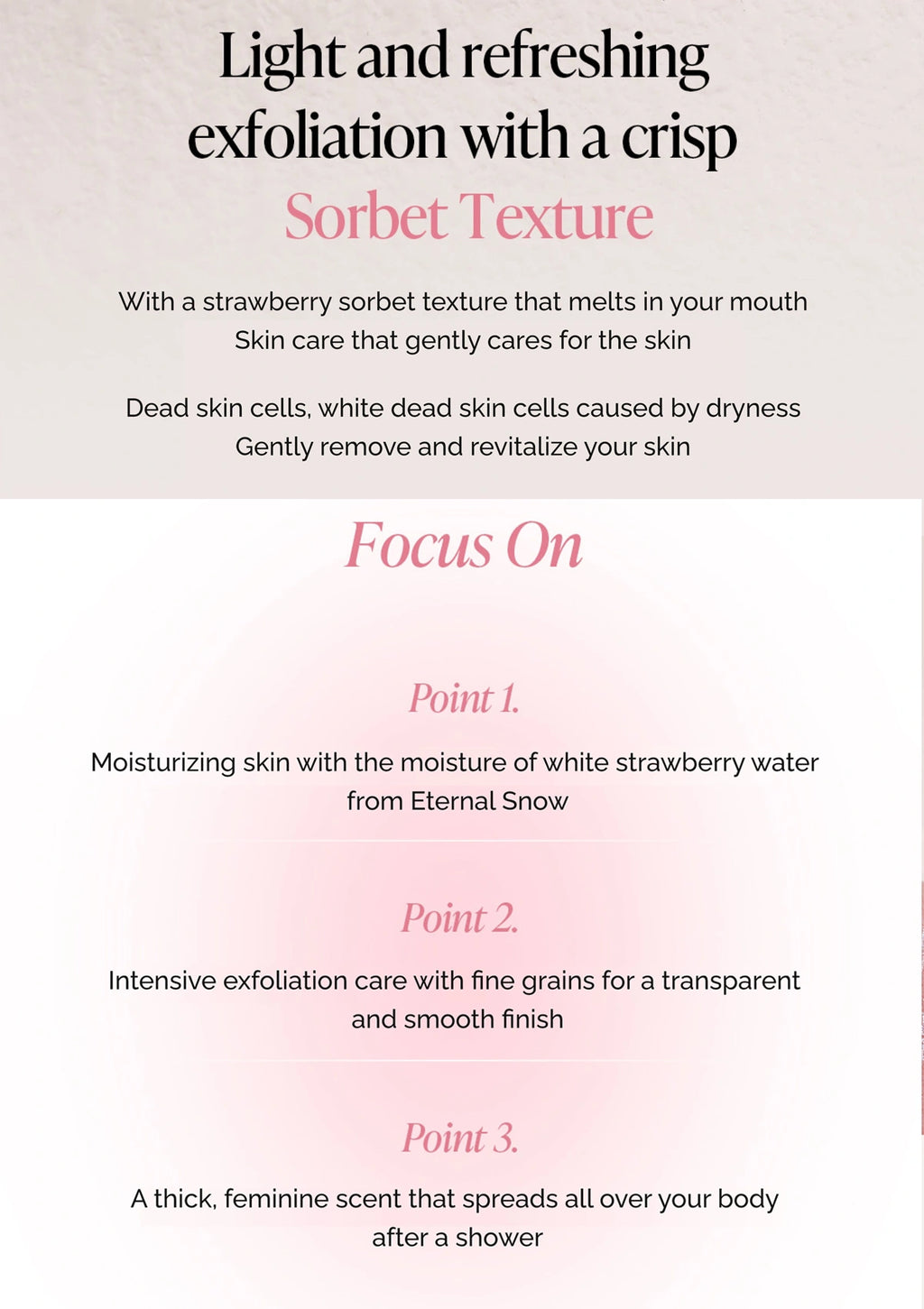Product description text with a strawberry sorbet texture and white strawberry water focus on moisturizing and exfoliating skin.