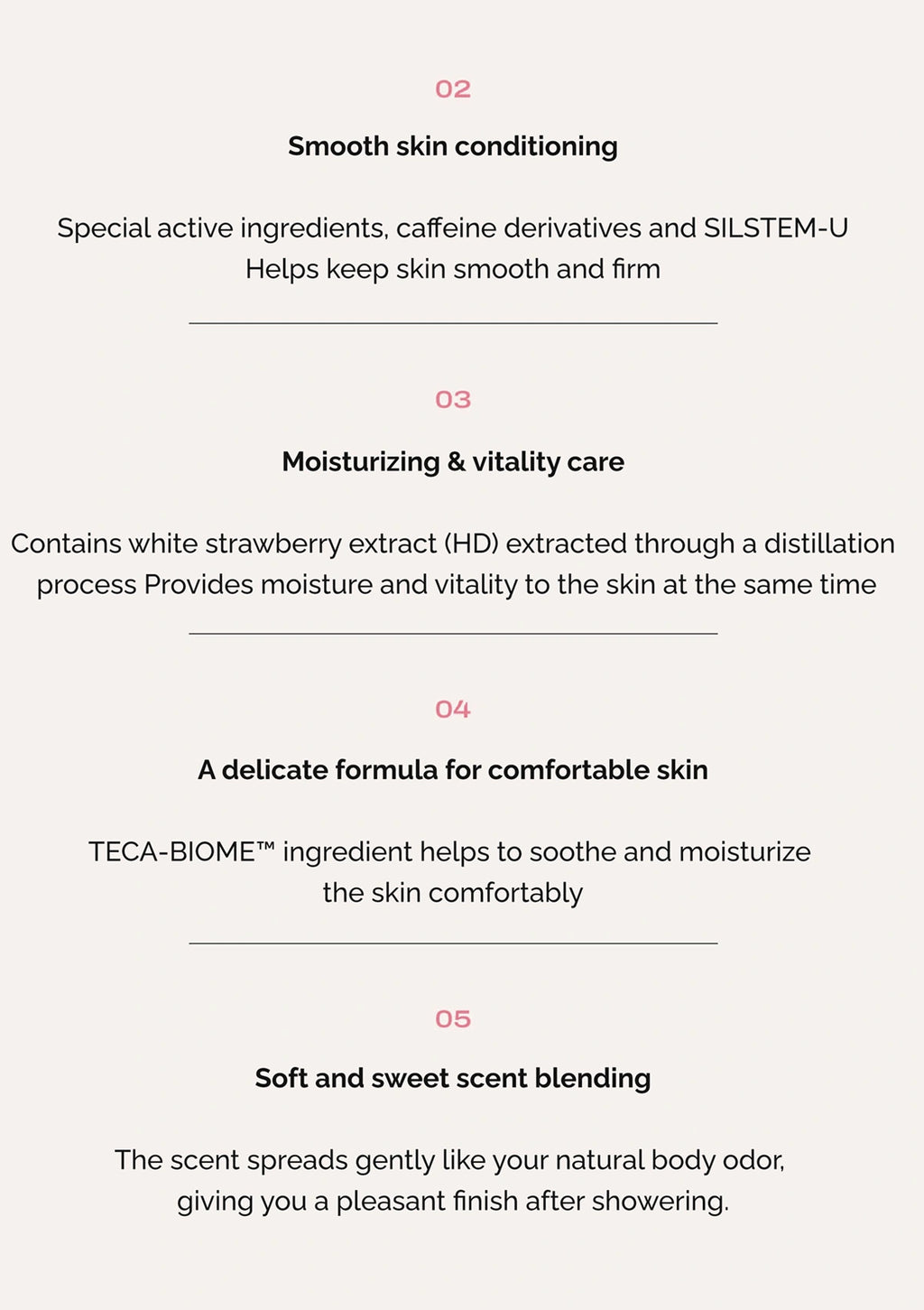 Text description of skincare product features on a white background