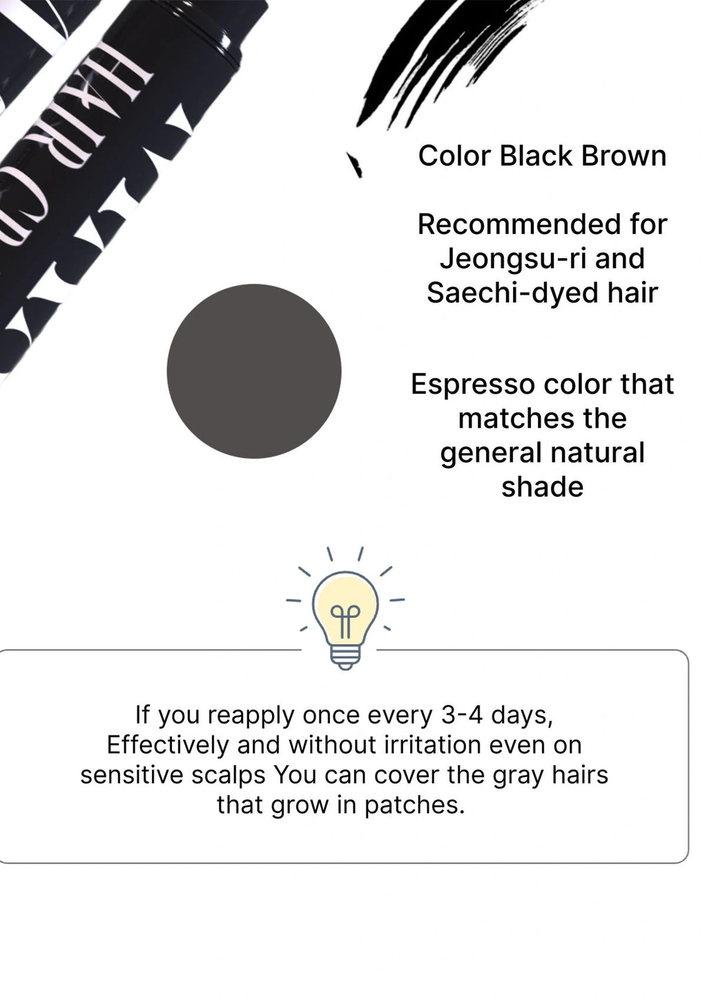 The new brush-type applicator glides smoothly to fill wide areas or define precise hairlines, blending effortlessly for a realistic finish. Its tested scalp-safe formula is enriched with natural extracts like jujube, angelica, mulberry bark, and black beans, ensuring gentle care while providing instant visible coverage.