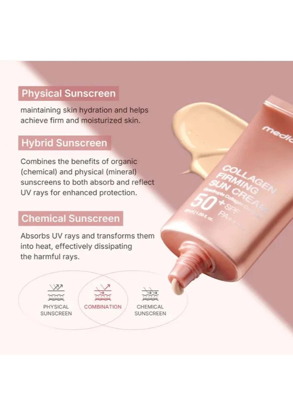 Collagen Firming Sun Cream with text on physical, hybrid, and chemical sunscreen types.