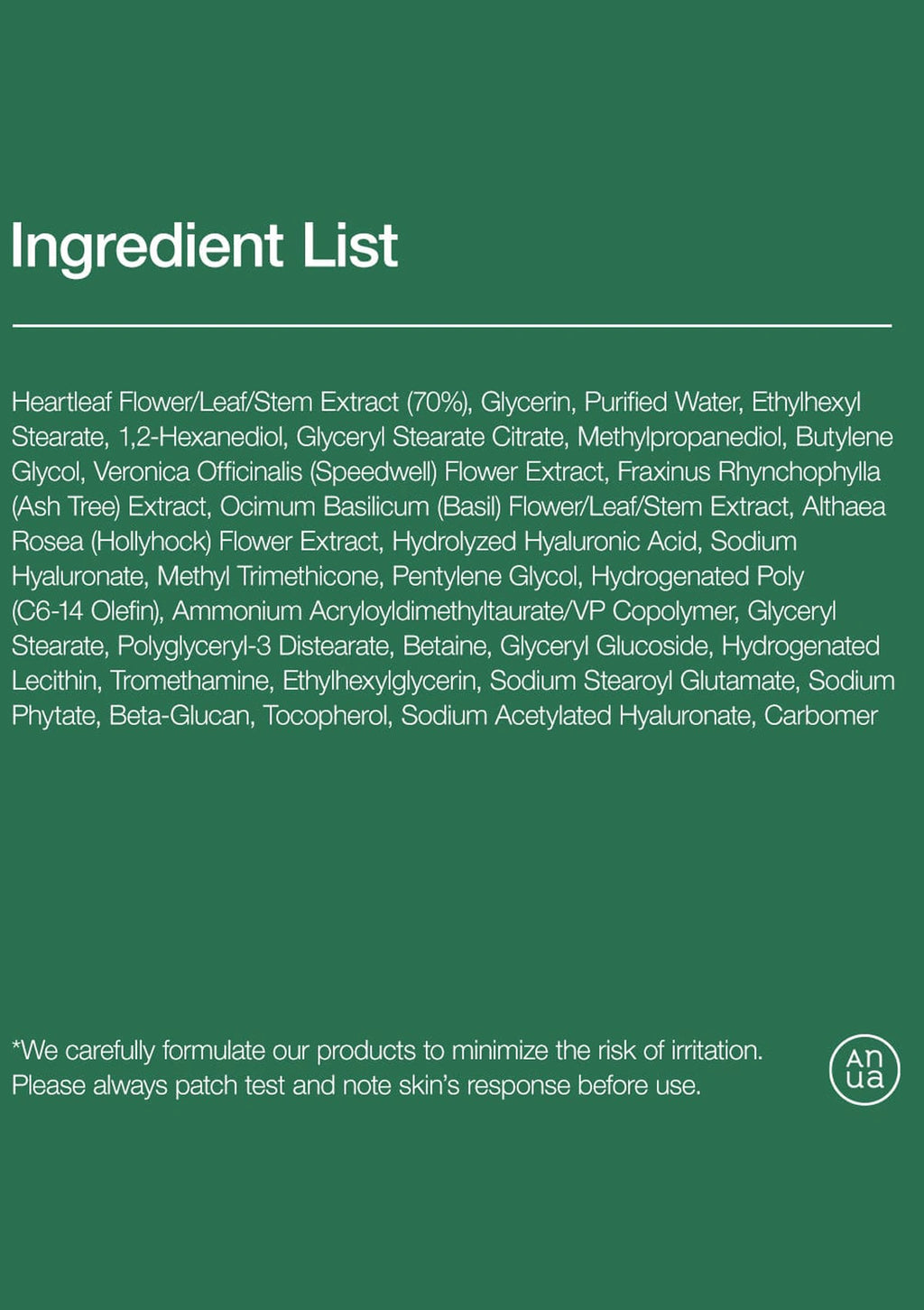 Water, Glycerin, 1,2-Hexanediol, Butylene Glycol, Houttuynia Cordata Extract, Glyceryl Stearate, Arginine, Carbomer, Ethylhexylglycerin, Sodium Stearoyl Glutamate, Glucose, Ulmus Davidiana Root Extract, Amaranthus Caudatus Seed Extract, Hydrogenated Lecithin, Tocopherol, Hydrolyzed Hyaluronic Acid, Sodium Acetylated Hyaluronate, Ethylhexyl Stearate, Trehalose, Laminaria Japonica Extract, Eclipta Prostrata Leaf Extract, Sodium Hyaluronate Skin, Beta-Glucan, Betaine, Ficus Carica (Fig) Fruit Extract, Glyceryl Glucoside, Glyceryl Stearate Citrate, Polyglyceryl-3 Distearate, Squalane, Fructooligosaccharides, Hydrogenated Poly(C6-14 Olefin), Butyrospermum Parkii (Shea) Butter, Centella Asiatica Extract, Methylpropanediol, Fraxinus Rhynchophylla Extract, Ceramide Np, Cetearyl Glucoside, Ocimum Basilicum Flower/Leaf/Stem Extract, Disodium EDTA, Sodium Hyaluronate, Methyl Trimethicone, Caprylic/Capric Triglyceride, Cetearyl Alcohol, Dipropylene Glycol.