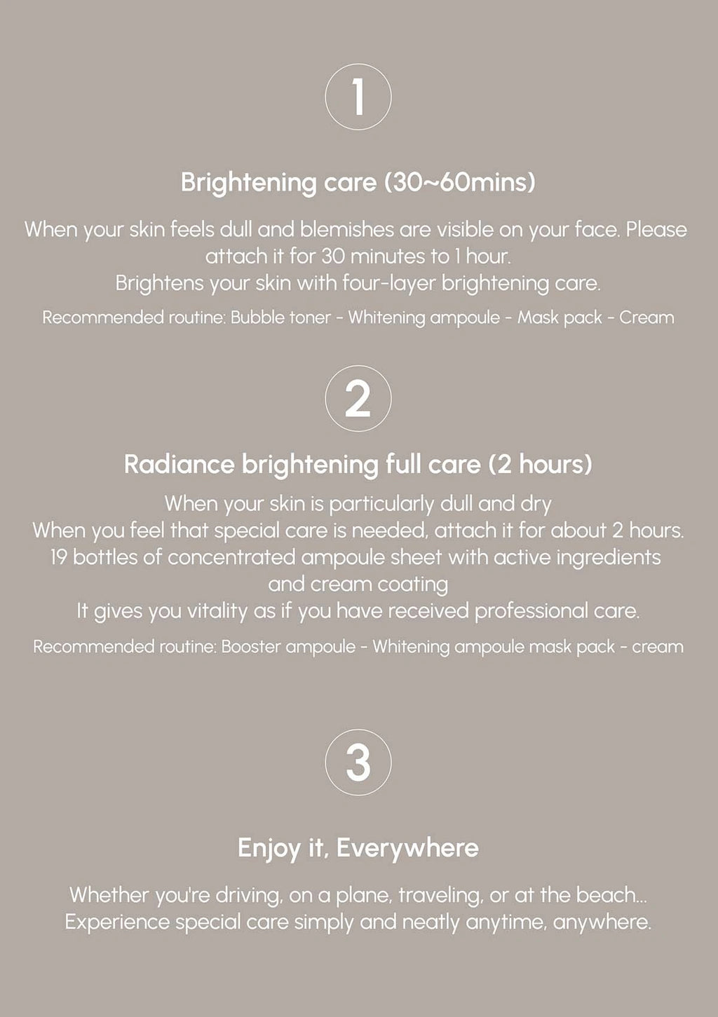 The Aida Glutathione Brightening Mask - Toning Effect is a premium skincare solution offering instant radiance and brightening care with 120,000ppm of pharmaceutical-grade glutathione. Using a patented 'cream coating' technique, this mask provides deep moisturization and a luminous glow that lasts all day. It features a quadruple brightening complex with glutathione, niacinamide, milk thistle extract, and VCE, alongside 7 natural plant extracts and panthenol to soothe and protect sensitive skin. Ideal for daily use or intensive treatment, this mask leaves your skin radiant, moisturized, and rejuvenated.