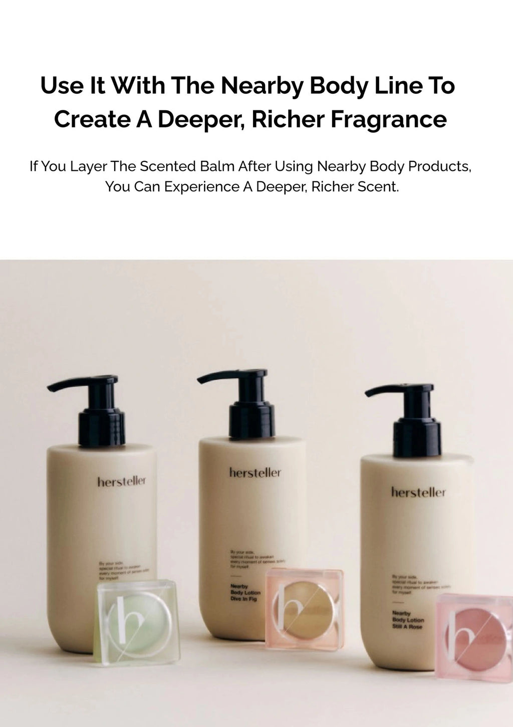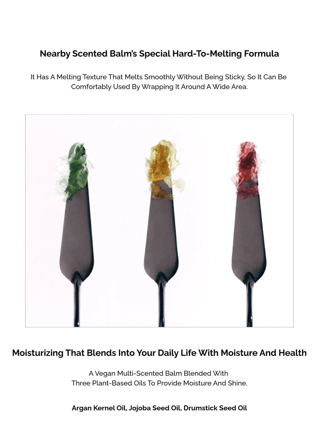 Step 4: Nearby Scented Balm Hydrates and nourishes with three oils, providing a smooth, non-sticky finish. It is eco-friendly, skin-friendly, and available in three refreshing scents for a sensory indulgence.
