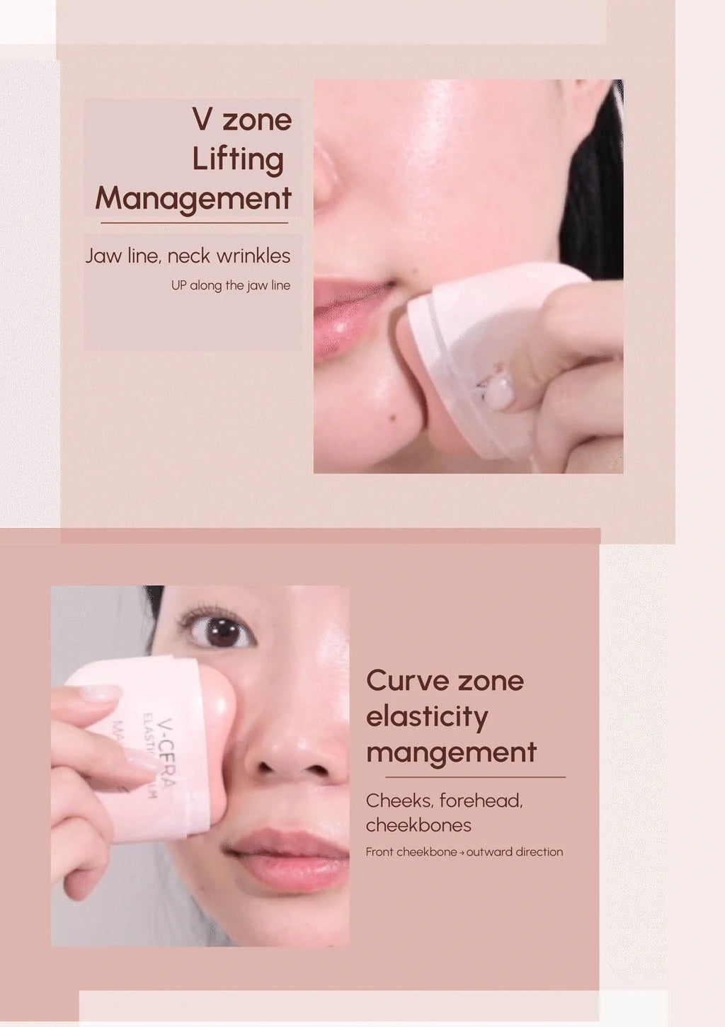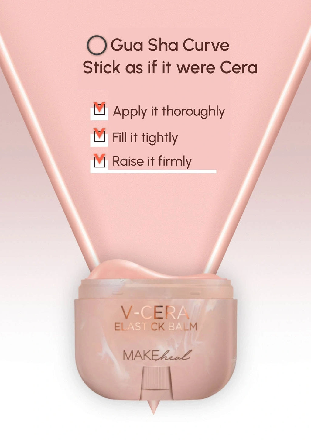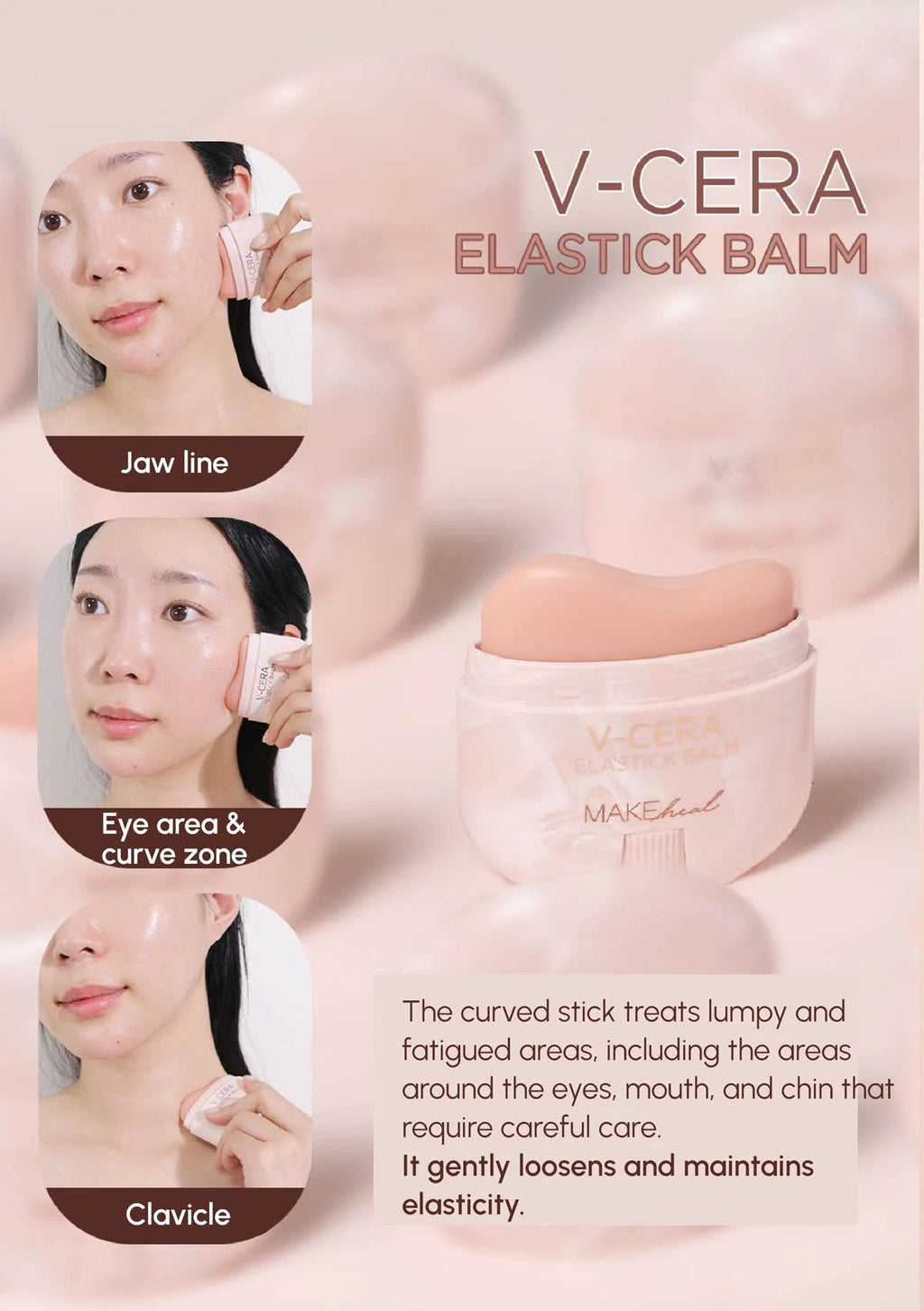 V-Cera Elastic Balm packaging with a woman applying it to her face.Woman with text about skin aging and a product recommendation on a pink backgroundV-Cera Elastick Balm packaging with text on a beige backgroundCosmetic product with text on morning care routine and a person applying it.Skincare guide with text on top and night care instructions on a pink and black backgroundV-CERA Elastick Balm advertisement with a woman using the product on her face.Instructions on how to use a skincare product with text and images of a person applying the product.Product packaging for V zone lifting and curve zone elasticity management with close-up of a person using the product.Cosmetic product application on face with text about ETC Wrinkle care and step-by-step instructions.V-Cera elastick balm with application instructions on a pink backgroundTwo L'OREAL ASTER BALMS on a pink background with text about clinical proven effectiveness.Two skincare test results showing improvement rates on a pink background.Graphs showing improvement rates for fine wrinkles around the eyes and skin elasticity after 4 weeks of use on a pink background.Makeheal V Cera Elastic Balm packaging with text on a pink backgroundProduct advertisement with customer reviews and benefits of using a stick balm and gua sha tool.Product packaging with text and images of a person applying a cream, set against a light pink background.Ingredients list for skincare product with text and icons on a pink backgroundProduct information card with images of ingredients and their benefits on a pink backgroundCosmetic product advertisement with text about moisturizing and wrinkle care, showing a close-up of a person's face before and after use.V Cera Elastic Balm with a hand holding it and a close-up of the balm on skin.Product packaging with text on a light pink background