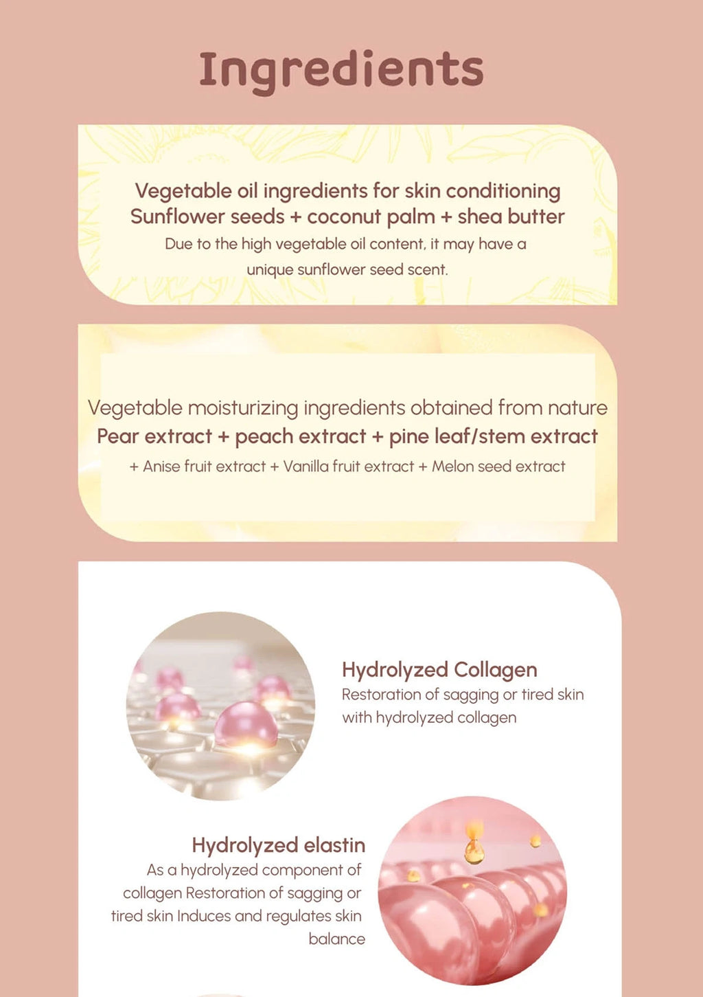 Sunflower Seed Oil, Octyldodecanol, Caprylic/capric Triglyceride, Polyglyceryl-2 Triisostearate, Synthetic Wax, Bis-diglyceryl Polyacyl Adipate-2, Coconut Palm Oil, Hydrogenated polyisobutene, Macadamia Seed Oil Polyglyceryl-6 Esters Behenate, Ethylene/propylene Copolymer, Shea Butter, Fragrance, Disteadimonium Hectorite, Alpha-bisabolol, propylene Carbonate, Glycerin, Tocopherol, Ethylhexylglycerin, Lecithin, Citronellol, Adenosine, Amylcinnamal, Eugenol, Hexylcinnamal, Purified Water, Diisostearyl Maleate, Rediron Oxide, Benzyl Salicylate, Butylene Glycol, Limonene, Lysine. Nalul, Cinnamal, 1,2-hexanediol, Hydrolyzed Elastin, Hydrolyzed Collagen, Sodium DNA, Acetyl hexapeptide-8,acetyl octapeptide-3, Copper Tripeptide-1, Palmitoyl Pentapeptide -4, Palmitoyl Tetrapeptide-7, Palmitoyl Tripeptide-1, Tripeptide-1, Tripeptide-2, Tripeptide-3.
