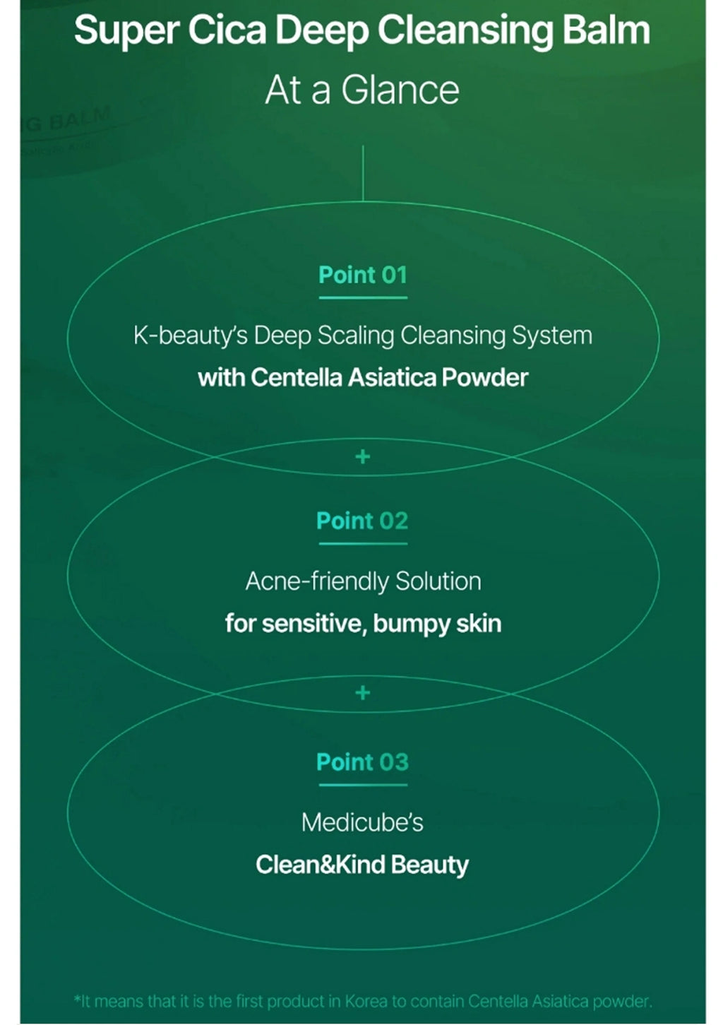 Product description card for Super Cica Deep Cleansing Balm with green background and white text.
