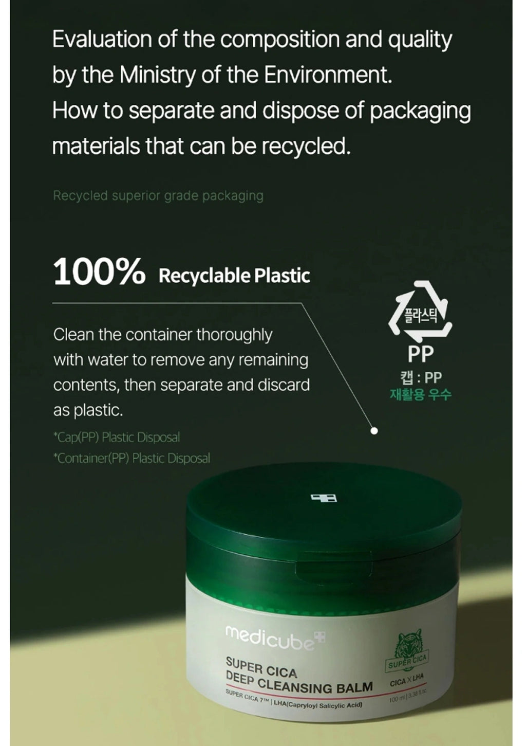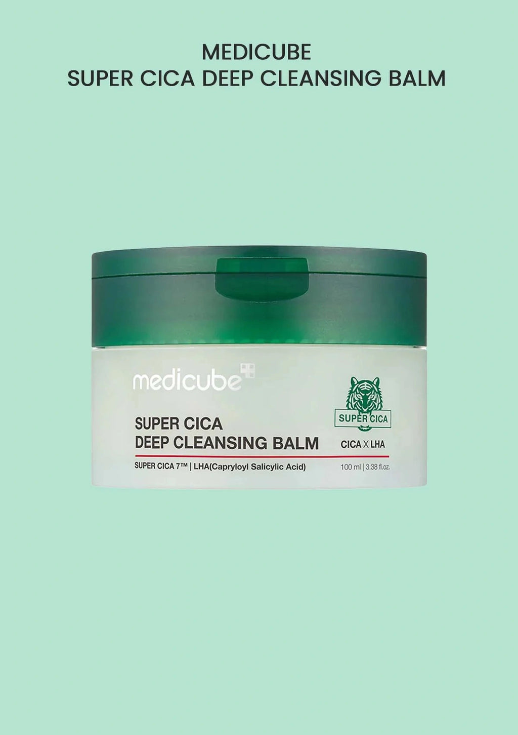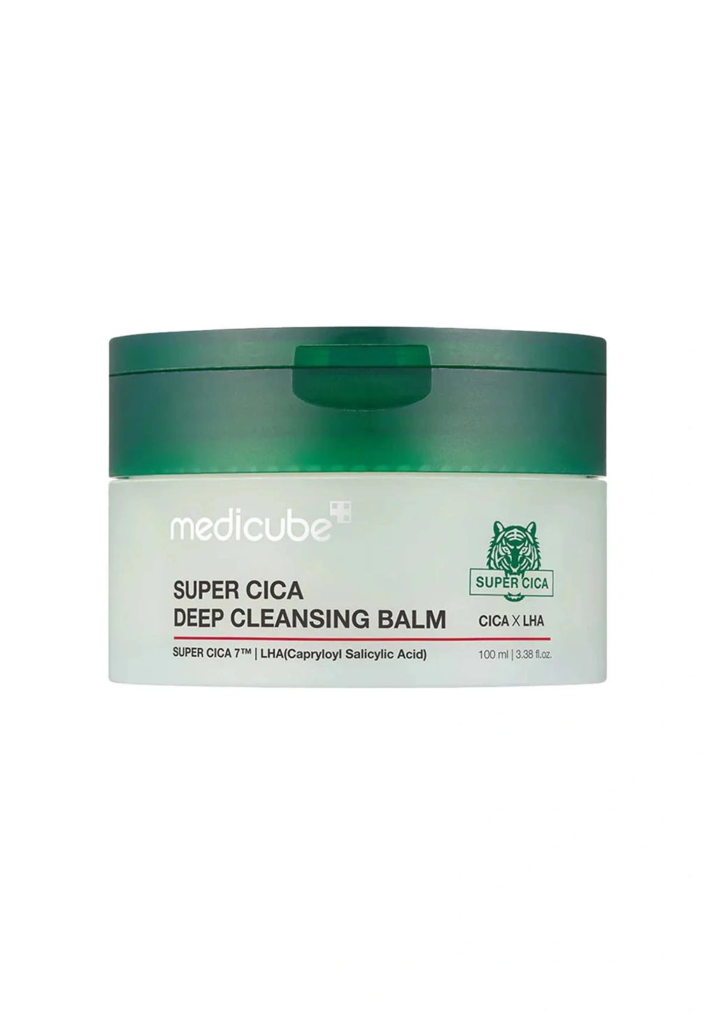 Super Cica Deep Cleansing Balm packaging with green lid on a dark background