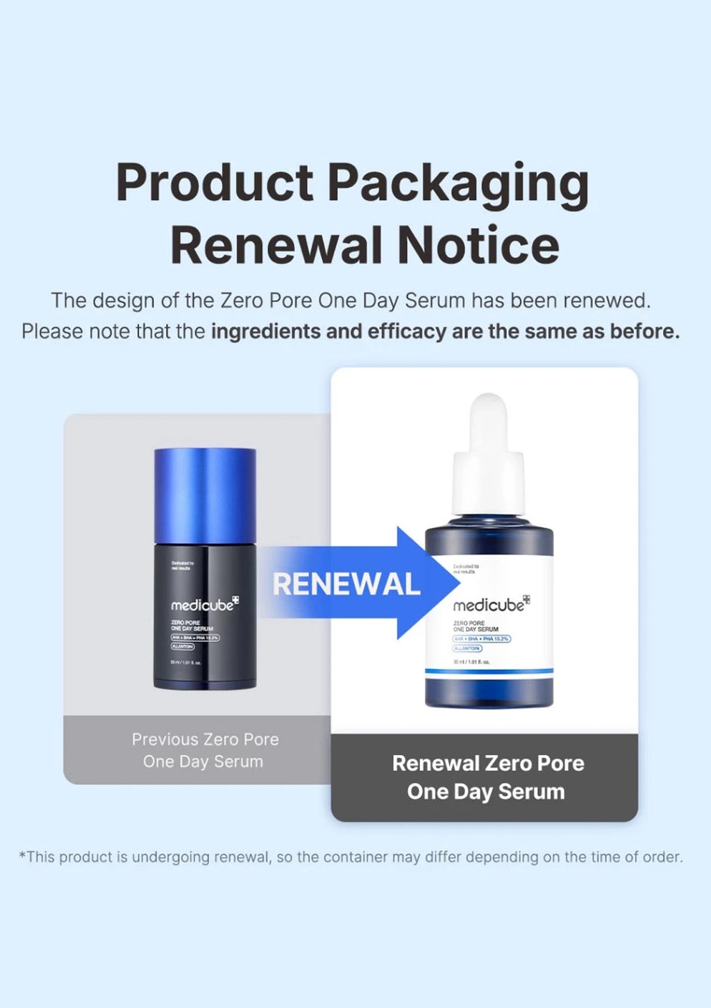 Medicube Zero Pore One-Day Serum has been renewed. Packaging MAY VARY according to the time of order. Return or refund requests will not be entertained for this reason.