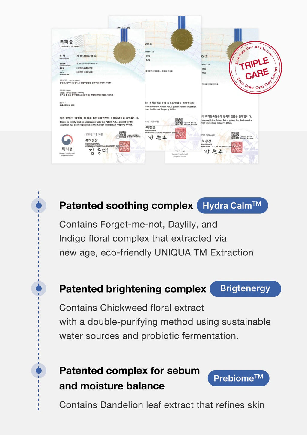 Product information card with patent details and benefits on a white background