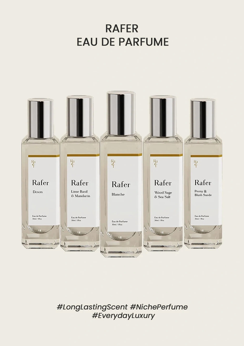 Each 30ml bottle encapsulates a unique olfactory experience, ranging from fresh florals to deep musks, ensuring there's a scent to match every personality and occasion. Whether you're seeking a daily signature fragrance or a special scent for events, Rafer's diverse lineup caters to all preferences.