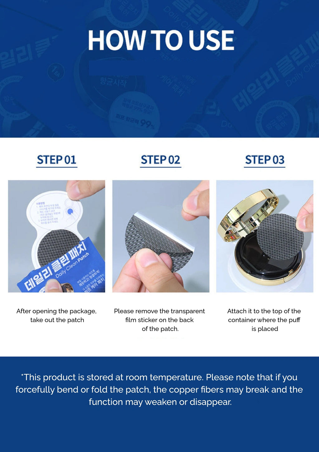 Verified by the Korea Standards and Testing Institute, this patch not only prevents bacterial growth but also neutralizes unpleasant odors, ensuring your puff remains fresh and clean for flawless makeup application. With its quick and easy application, the Daily Clean Patch is ideal for anyone looking to enhance their skincare routine. Simply remove the patch from its packaging, peel off the transparent film, and attach it directly to the area where your puff is stored.