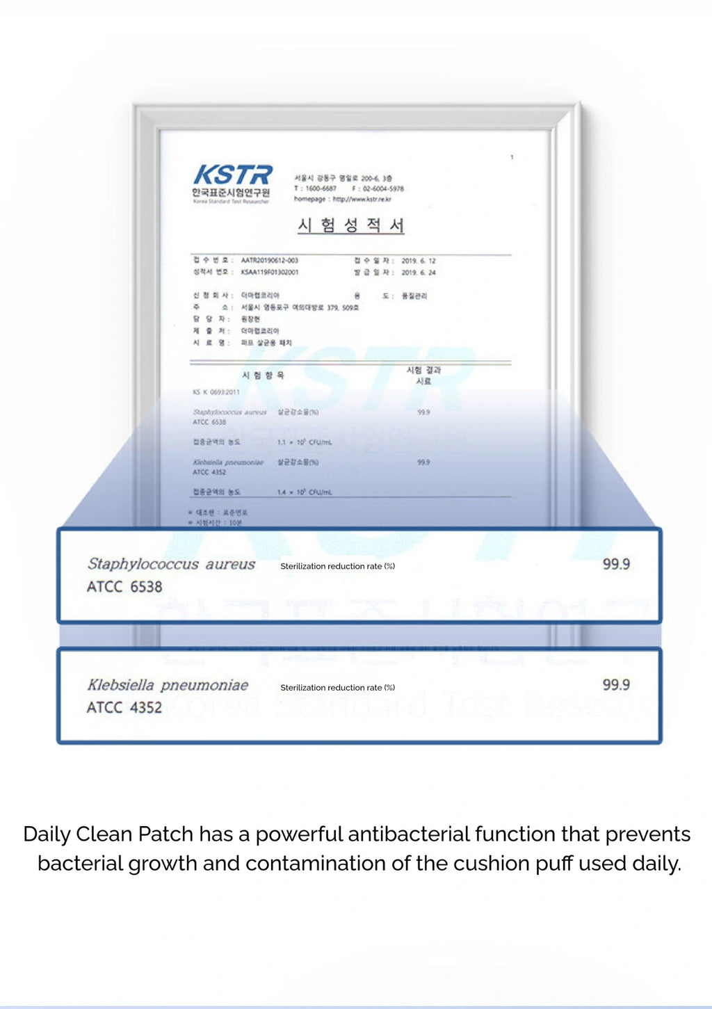 KSTR certification for Daily Clean Patch with bacterial growth data on a white background