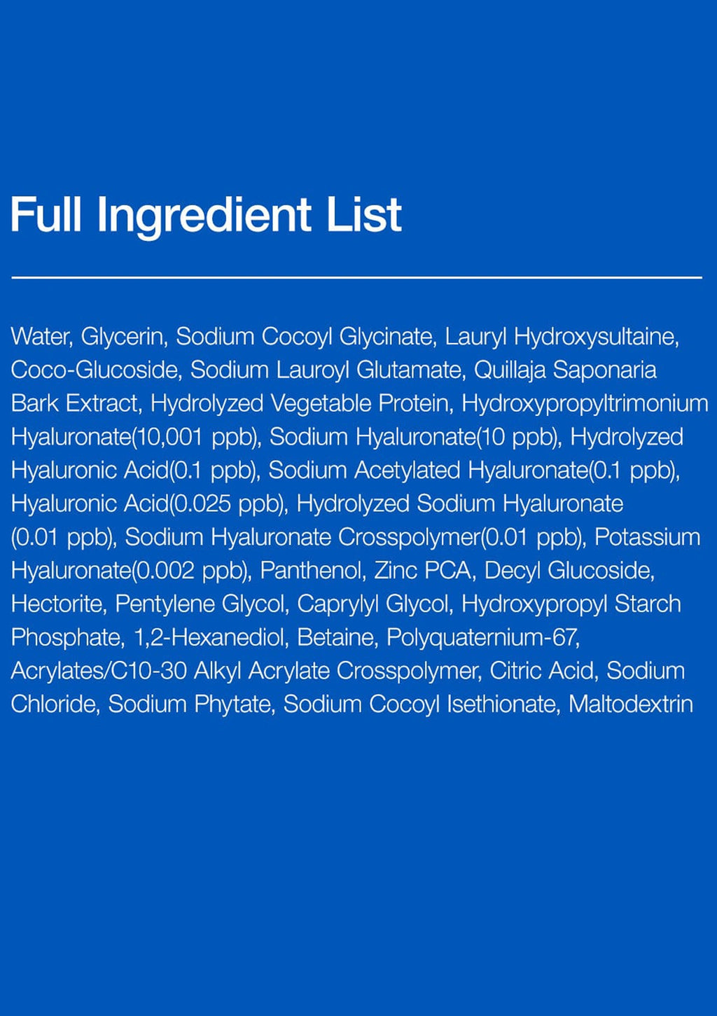 Water, Glycerin, Sodium Cocoyl Glycinate, Lauryl Hydroxysultaine, Coco-glucoside, Sodium Lauroyl Glutamate, Quillaja Saponaria Bark Extract, Hydrolyzed Vegetable Protein, Hydroxypropyltrimonium Hyaluronate, Sodium Hyaluronate, Hydrolyzed Hyaluronic Acid, Sodium Acetylated Hyaluronate, Hyaluronic Acid, Hydrolyzed Sodium Hyaluronate, Sodium Hyaluronate Crosspolymer, Potassium Hyaluronate, Panthenol, Zinc Pca, Decyl Glucoside, Hectorite, Pentylene Glycol, Caprylyl Glycol, Hydroxypropyl Starch Phosphate, 1,2-hexanediol, Betaine, Polyquaternium-67, Acrylates/c10-30 Alkyl Acrylate Crosspolymer, Citric Acid, Sodium Chloride, Sodium Phytate, Sodium Cocoyl Isethionate, Maltodextrin.