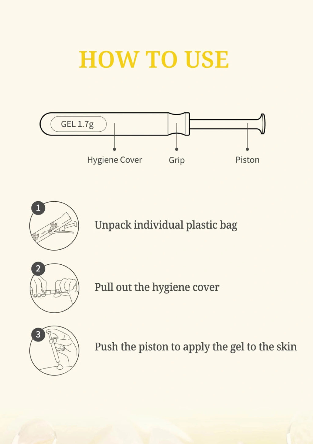 1. Apply the Yellohana Vegan Inner Gel directly to the Y-zone. After removing cover and cap, insert syringe at least 3cm inside your vagina, press to dispense and spread gel evenly.
