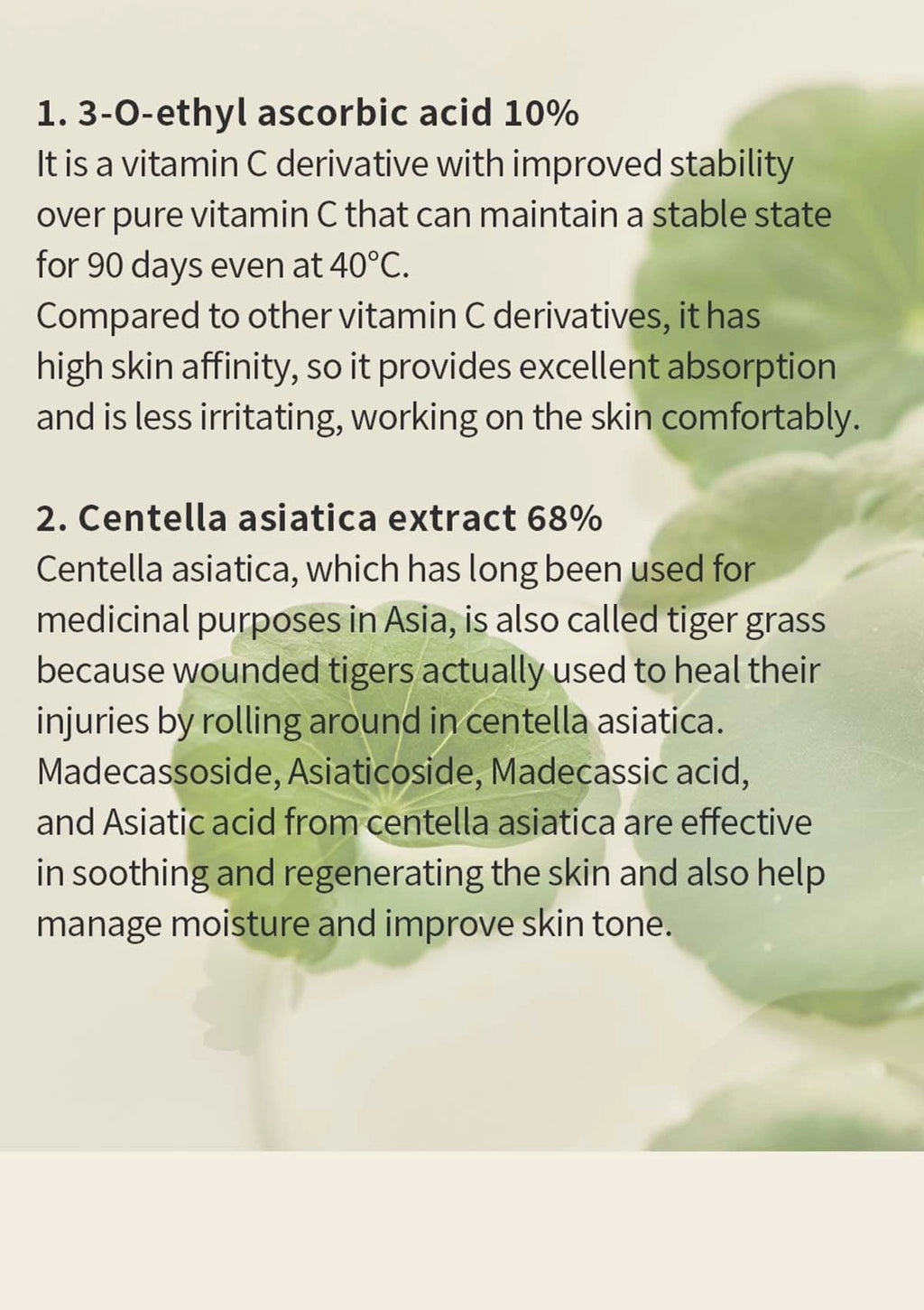 Organic Centella asiatica extract with a high active ingredient content is used and blended together to further enhance skin soothing and moisturization. Centella asiatica, which has long been used for medicinal purposes in Asia, is also called tiger grass because wounded tigers actually used to heal their injuries by rolling around in centella asiatica.