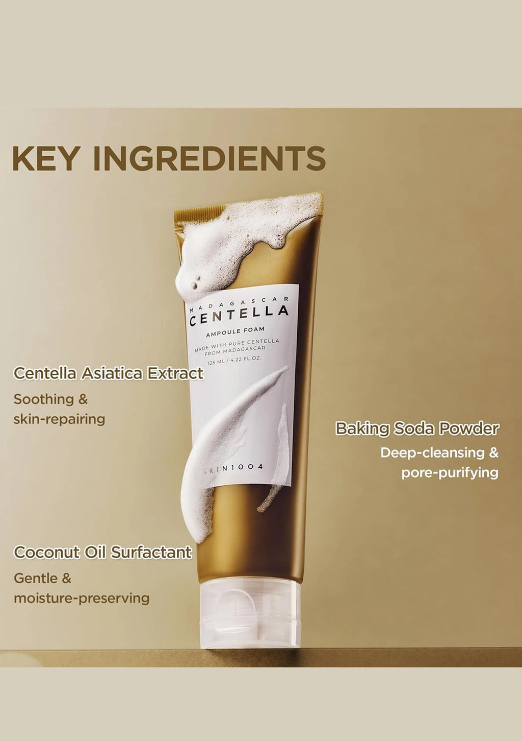 Centella extract, sodium cocoyl isethionate, glycerine, purified water, sodium methyl cocoyl taurate, coco-betaine, potassium cocoyl, glycinate, 1,2-hexxanediol, sodium chloride, potassium cocoate, potassium benzoate, polyquaternium-67, citric acid, dextrin, sodium bicarbonate, cacao extract, disodium EDTA, sodium acetate, butylene glycol, coptis chinensis root extract, sodium hyaluronate, eclipta extract, coccinia indica fruit extract.