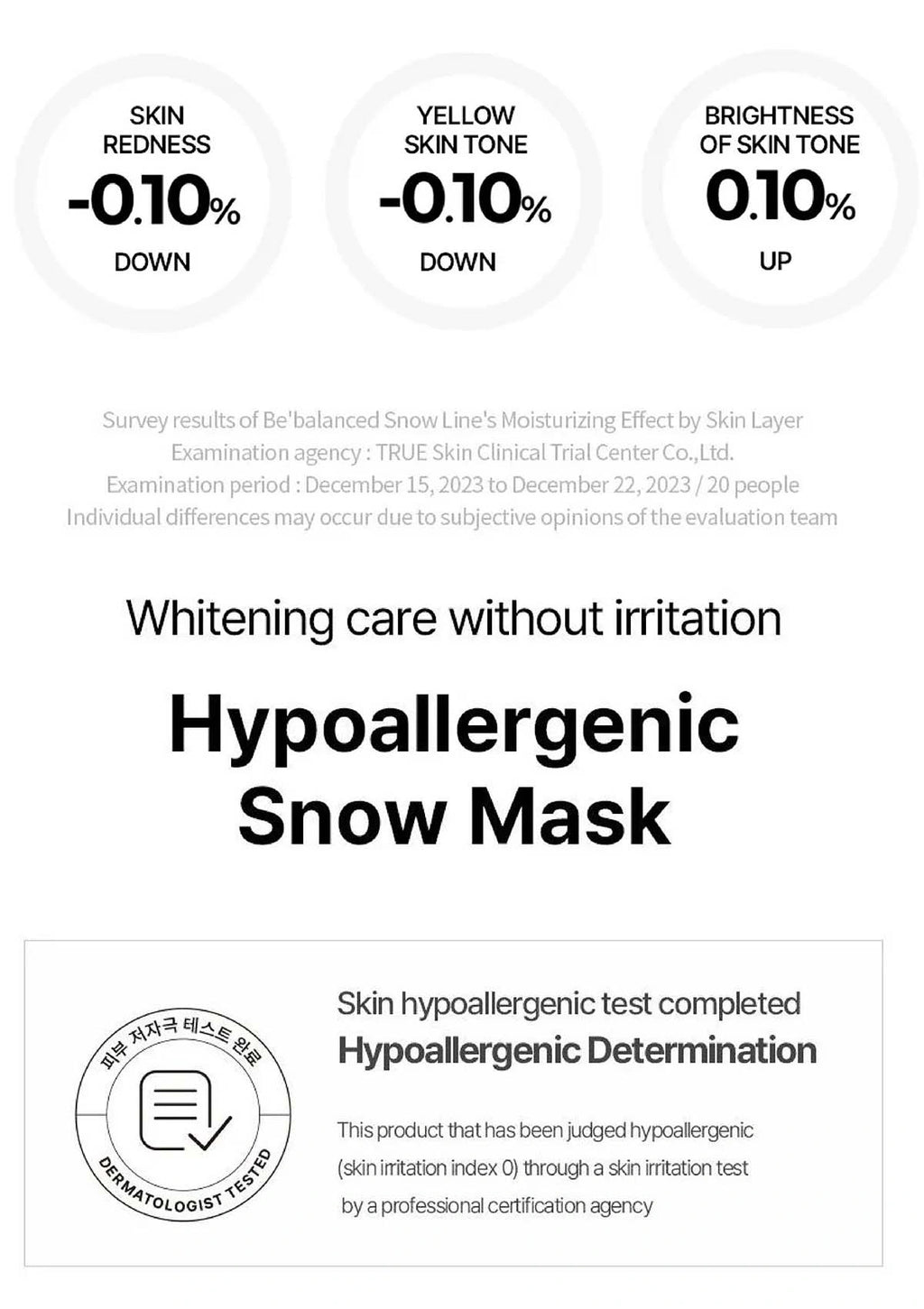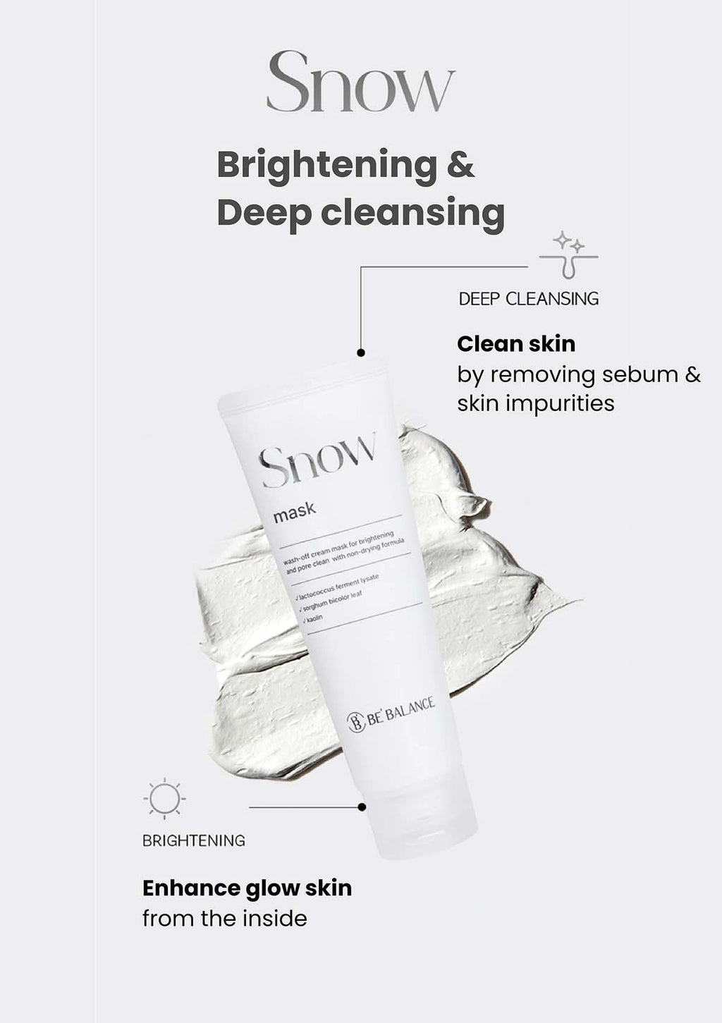 Be’Balance Snow Mask is an upgraded wash-off cream mask that delivers brighter, clearer skin while deeply cleansing pores with its non-drying formula. This enhanced version features Kaolin clay to absorb excess sebum and impurities, Lactococcus Ferment Lysate to protect the skin barrier, and the patented SUSU 10 Ferm complex for improved skin hydration and soothing effects. Designed for daily whitening care without irritation, this mask shows a difference in just one use and helps achieve even, radiant skin in just 7 days.