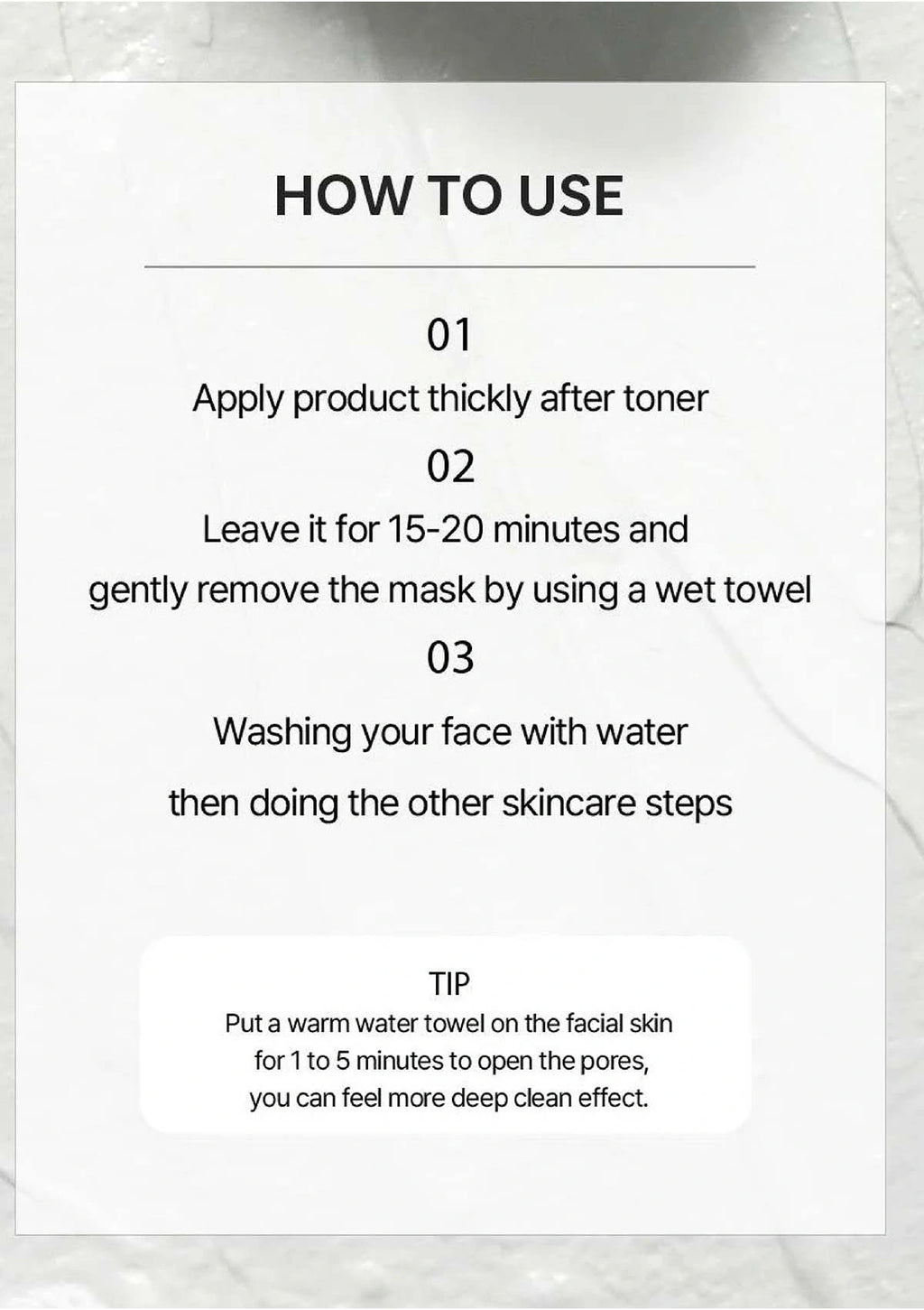 Tip: Before applying, place a warm towel on your face for 1-5 minutes to open pores and enhance the deep-cleansing effect!