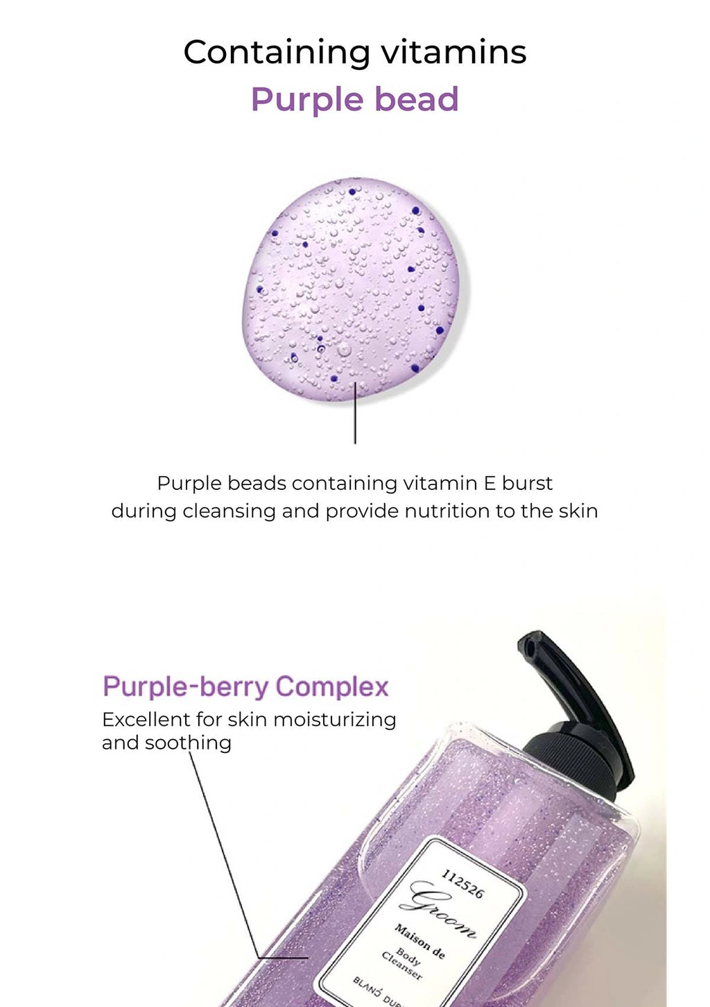 Groom's 112526 Maison De Body Cleanser offers a gentle yet effective cleansing experience. Its mild cleaning ingredients form a dense foam that washes away impurities without stripping the skin of its natural moisture. This vitamin-rich cleanser contains purple beads filled with vitamin E that pop during cleansing, providing nourishment to the skin. The purple-berry complex in the formula helps moisturize and soothe the skin, leaving it feeling refreshed and revitalized.