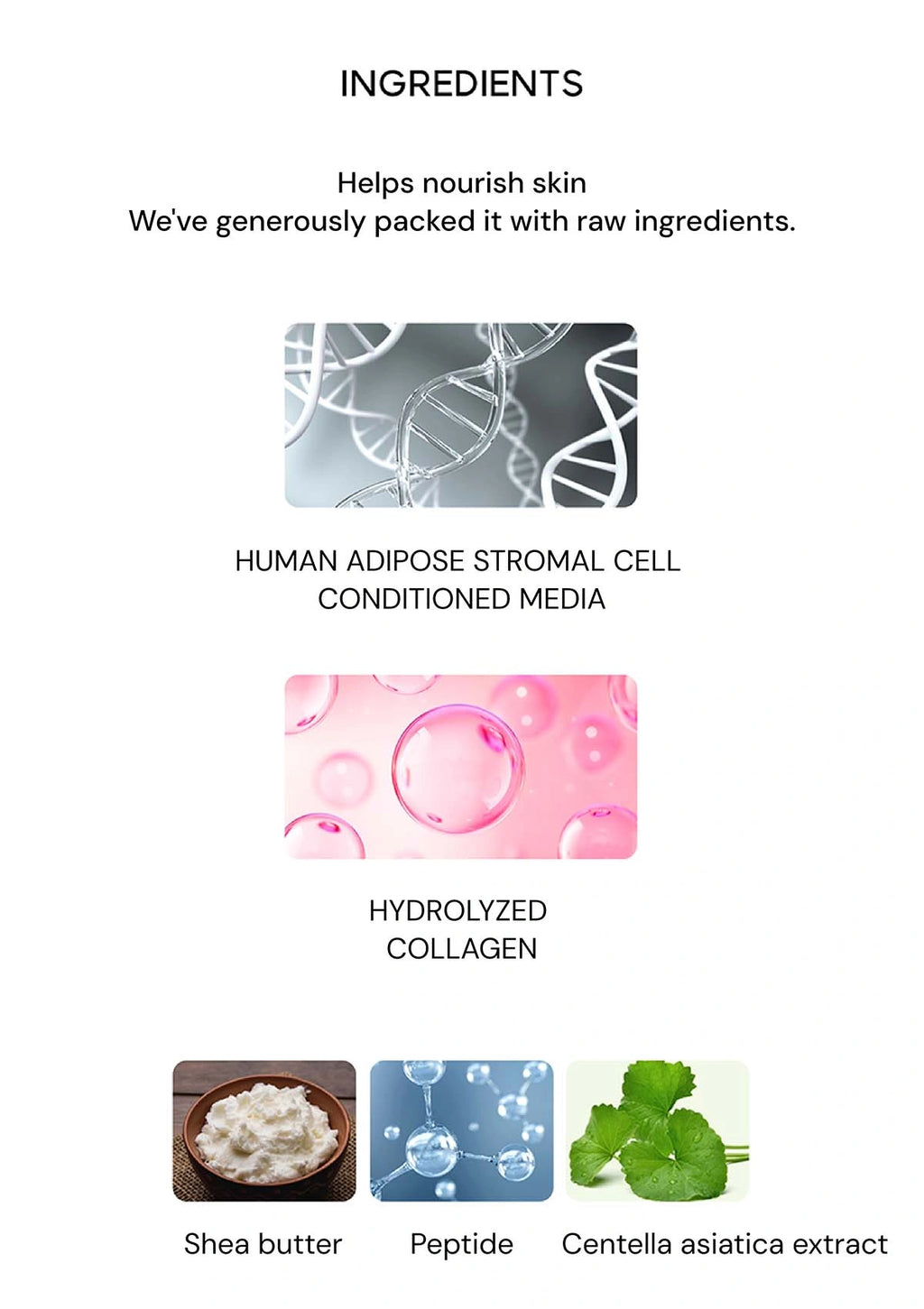 Purified Water, Dipropylene Glycol, Glycerin, Caprylic/capric Triglyceride, Niacinamide, carob Gum, Betaine, Erythritol, Irish Moss Powder, Irish Moss Extract, Panthenol, Butylene Glycol, cellulose Gum, Shea Butter, Peony Root Extract, Centella Asiatica Extract, 1,2-hexanediol, Potassium Chloride, Sodium Polyacrylate, Matricaria Flower Extract, Hydrogenated Polydecene, Glyceryl Caprylate, Sucrose, Adenosine, Ethylhexylglycerin, Argania Kernel Oil, Propanediol, Hydrolyzed Collagen (4.1 Mg), Jojoba Seed Oil, Trideceth-6, Cetearyl Glucoside, Human Adipose Stromal Cell Culture Medium (4.1 Mg), Pantolactone, Glyceryl Stearate, Aphanothecium Sacrum Exopolysaccharides, Benzyl Glycol, Cetearyl Alcohol, Hydrolyzed Glycosaminoglycans, Sodium Hyaluronate, Sodium Hyaluronate Crosspolymer, Polysorbate 60, Polyglyceryl-10 Laurate, Polyglyceryl-3 Methyl Glucose Distearate, Hydrolyzed Hyaluronic Acid, Hydroxypropyl Trimonium Hyaluronate, Peg-100 Stearate, Tripeptide-1, Ha Copper Tripeptide-1, Acetyl Tetrapeptide-5, Acetyl Tetrapeptide-2, Dialuronic Acid, Palmitoyl Pentapeptide-4, Palmitoyl Tripeptide-1, Hexapeptide-9, Hexapeptide-11, Sodium Acetylated Hyaluronate, Palmitoyl Tripeptide-5, Disodium Edta, Fragrance.