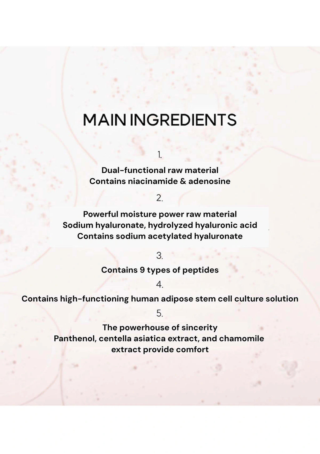Purified Water, Dipropylene Glycol, Glycerin, Caprylic/capric Triglyceride, Niacinamide, Carob Gum. Beerythritol, Irish Moss Powder, Irish Moss Extract, Panthenol, Butylene Glycol, Cellulose Gum, Shea Butter, Tine, Peony Root Extract, Centella Asiatica Extract, 1,2-hexanediol, Potassium Chloride, Sodium Polyacrylate, Hydrogenated Polydecene, Glyceryl Caprylate, Sucrose, Adenosine, Tricaria Flower Extract, Argania Kernel Oil, Propanediol, Hydrolyzed Collagen, Jojoba Seed Oil, Trideceth-6. Tilhexylglycerin, Human Adipose Stromal Cell Culture Medium, Pantolactone, Glyceryl Stearate, Aphanoteke Teal Glucoside, Sacrum Exopolysaccharides, Benzyl Glycol, Cetearyl Alcohol, Hydrolyzed Glycosaminoglycan, Sodium Hyaluronate, Sodium Hyaluronate Crosspolymer, Polysorbate 60, Polyglyceryl-10 Laurate, Polyglyceryl-3 Methyl Glucose Distearate, Hydrolyzed Hyaluronic Acid, Ha Peg-100 Stearate, Tripeptide-1 Hydroxypropyltrimonium Hyaluronate, Hyaluronic Acid, Copper Tripeptide-1. Acetyl Tetrapeptide-5, Acetyl Tetrapeptide-2. Palmitoyl Pentapeptide-4, Palmitoyl Tripeptide-1, Hexapeptide-9, Hexapeptide-11. Sodium Acetylated Hyaluronate, Palmitoyl Tripeptide-5, Disodium Edta, Fragrance.