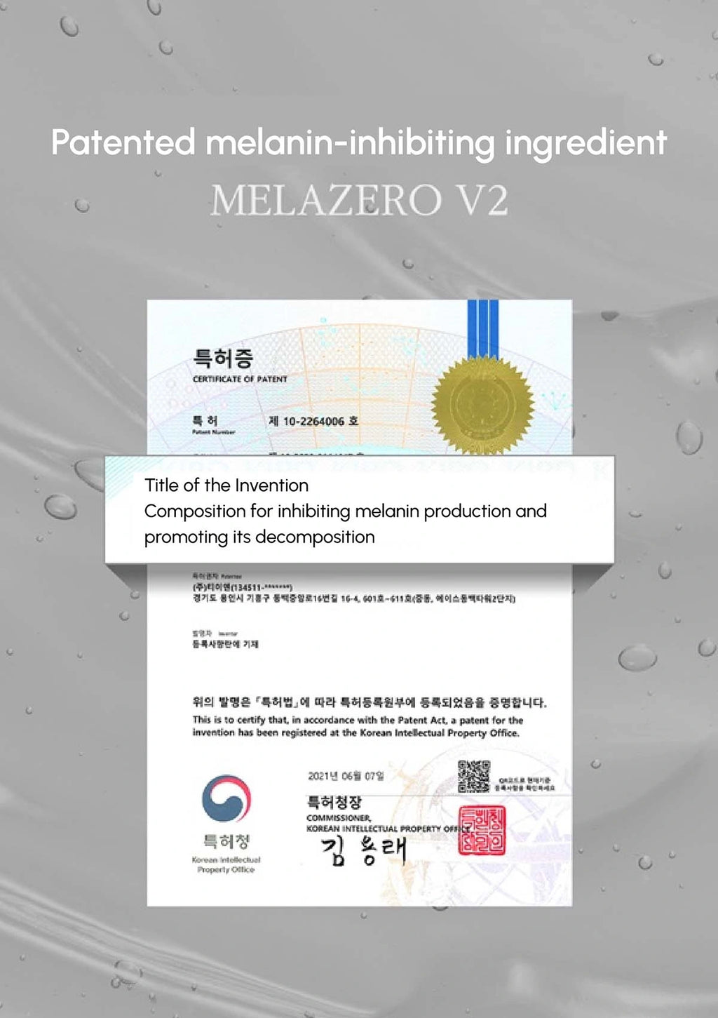 Patented melanin-inhibiting ingredient MELAZERO V2 with a certificate of patent on a gray background