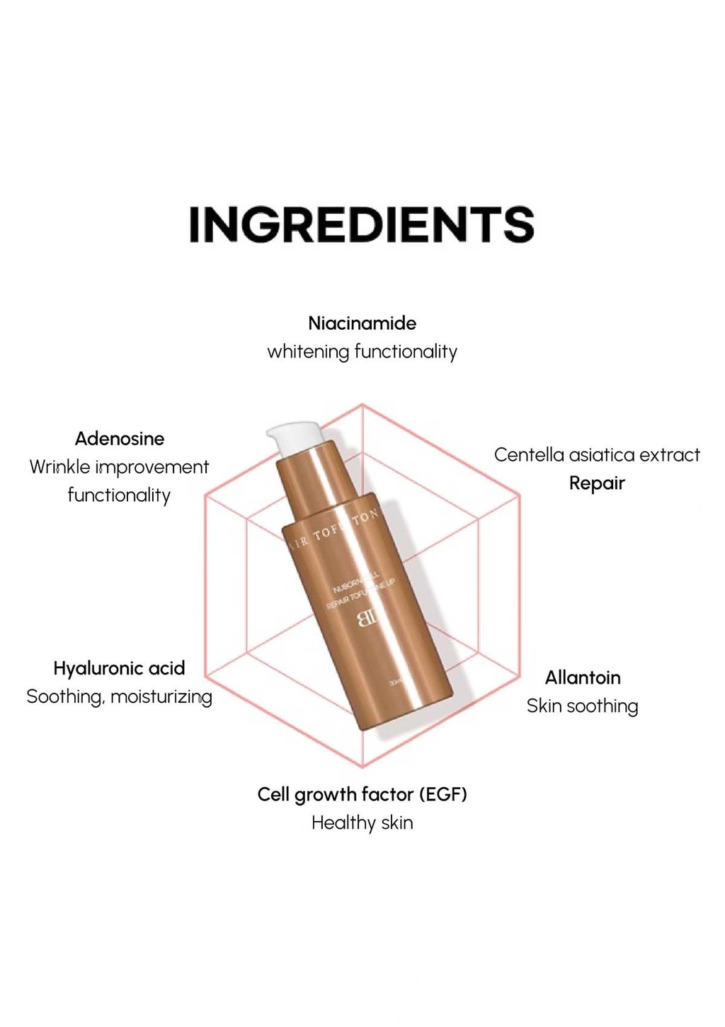Purified Water, Cyclopentasiloxane, Butylene Glycol, Ethylhexyl Methoxycinnamate, Cetyl Ethylhexanoate, Titanium Dioxide, Betaine, Dimethicone, Caprylic/ Capric Triglyceride, Niacinamide, Polysol, Bate 60, Sodium Chloride, Zinc Oxide, Cetyl PEG/ PPG-10/1 Dimethicone, Hydrogenated Lecithin, Yellow Iron Oxide, Stearic Acid, Isoamyl P- Methoxy Cinnamate, Diethylaminohydroxybenzoylhexylbenzoate, Quaternium-18 Bentonite, Aluminum Hydroxide, Bis- Ethylhexyloxyphenol Methoxyphenyltriazine, Red Iron Oxide, Silica, Chlorphenesin, Black Iron Oxide, Tocopheryl Acetate, talc, Phytosteryl/ Octyldodecyllauroyl Glutamate, Fragrance, Behenic Acid, Allantoin, Adenosine, Hydrogen Dimethicone, Triethoxycaprylylsilane, Sodium DNA, 1,2- Hexanediol, BHT, Laurolylysine, Sodium Hyaluronate, Centella Asiatica Leaf Extract, SH- Oligopeptide-1.