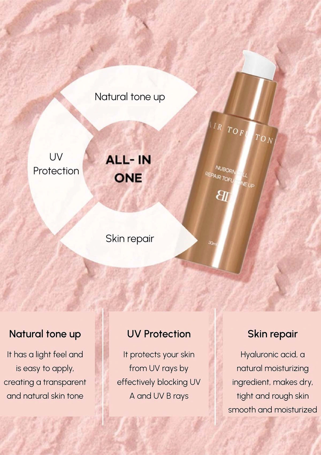 Introducing Blanc Dubu Nuborn Cell Repair Tofu Tone Up, a revolutionary triple-functional cosmetic designed to elevate your skincare routine. This all-in-one solution seamlessly combines the benefits of wrinkle improvement, whitening, and UV protection with its advanced formula. The light and easily applicable cream create a transparent and natural skin tone, effectively blocking both UV A and UV B rays, thanks to its SPF40 and PA++ protection. Enriched with Hyaluronic acid, a natural moisturizing ingredient, this cream works wonders by making dry, tight, and rough skin smooth and deeply moisturized.