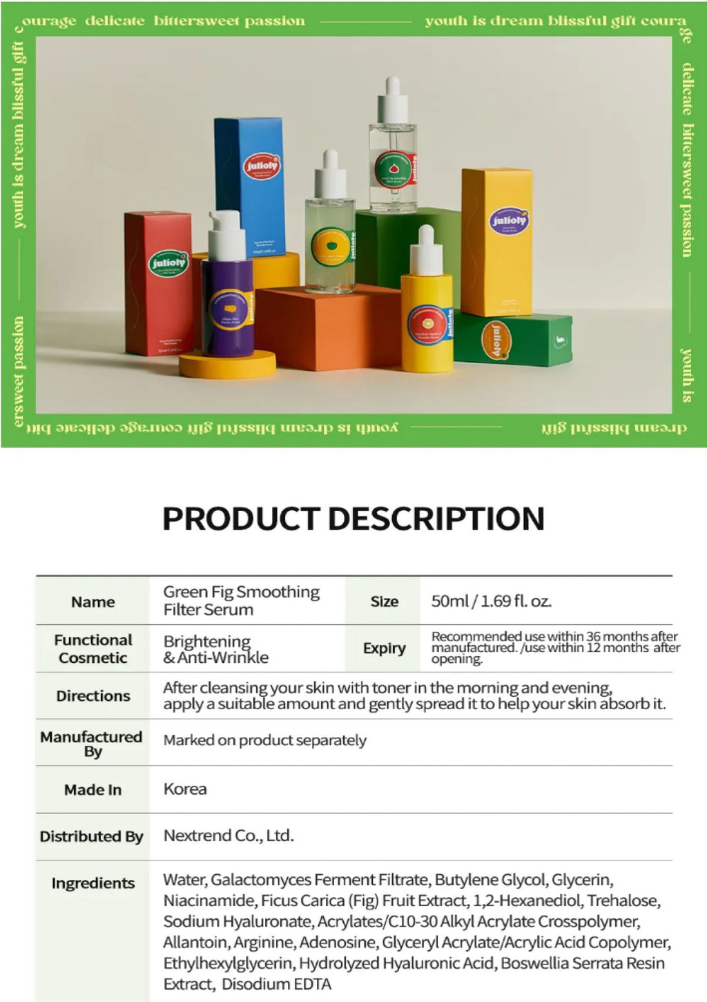 Experience radiant, filter-smooth skin with Julioly’s Green Fig Smoothing Filter Serum — a breakthrough formula designed to refine skin texture and restore natural glow.
