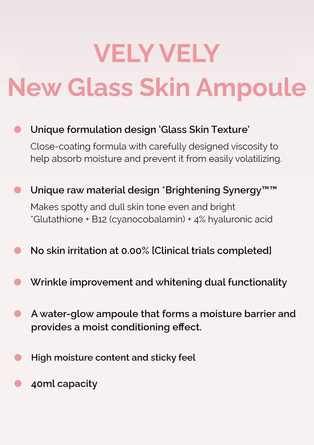 The Vely Vely Glass Skin Ampoule delivers a luminous, dewy glow with every drop. Infused with glutathione, vitamin B12, and four types of hyaluronic acid, this ampoule deeply hydrates, brightens dull skin, and smooths uneven texture. Its unique water-gloss coating gives a radiant, glass-like finish without stickiness. Lightweight yet powerful, it provides long-lasting moisture and plumpness—an essential step for visibly healthy, glowing skin.