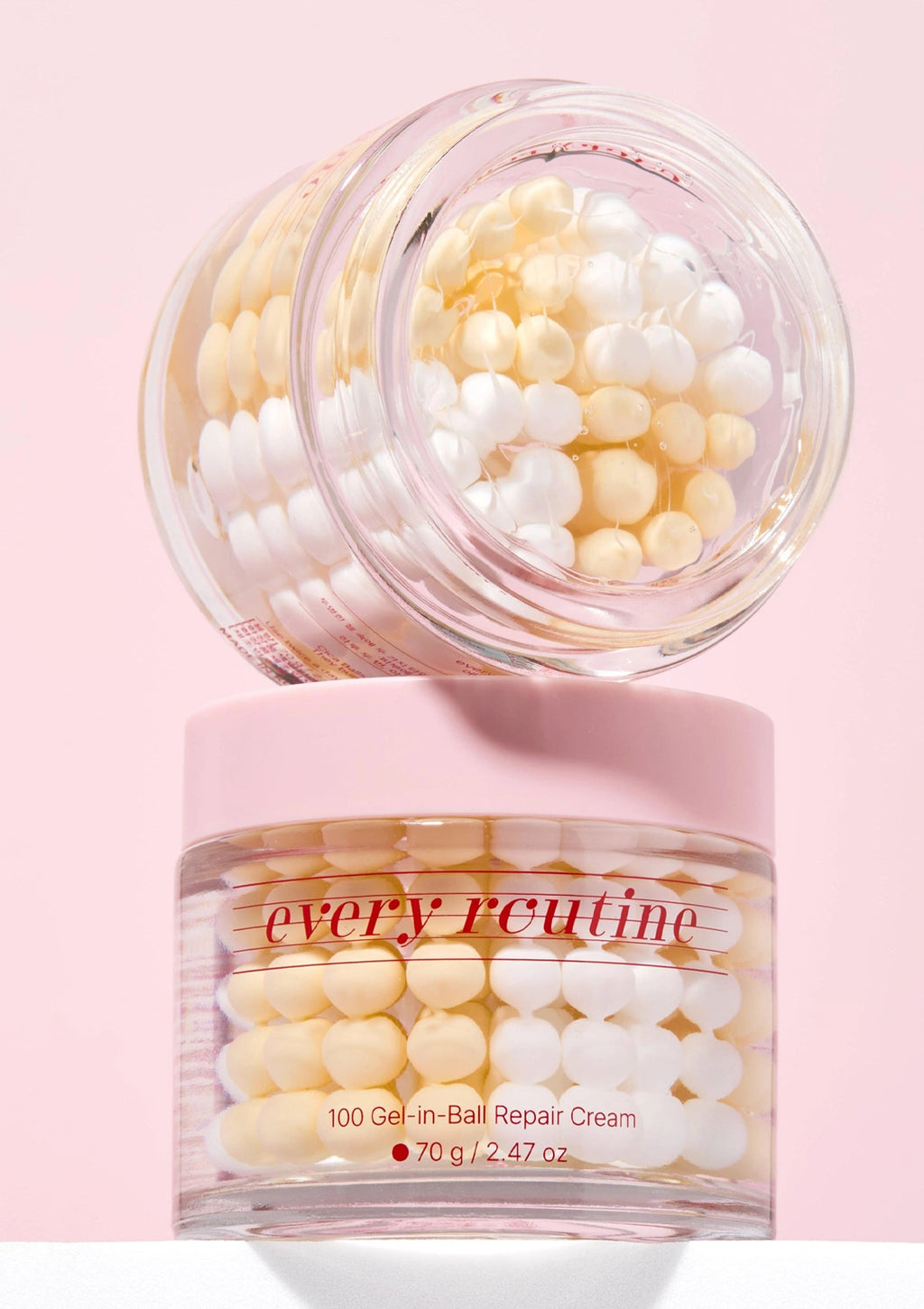 Every Routine Every Routine 100 Gel-in-Ball Repair Cream is an innovative, multi-functional skincare solution designed to adapt to your skin’s daily needs. Packed with 100 tiny balls containing active ingredients, you can customize your routine: use the Probiotic Ball in the morning for barrier support, the Cica Ball at night for calming, or just the gel for deep, refreshing moisture.