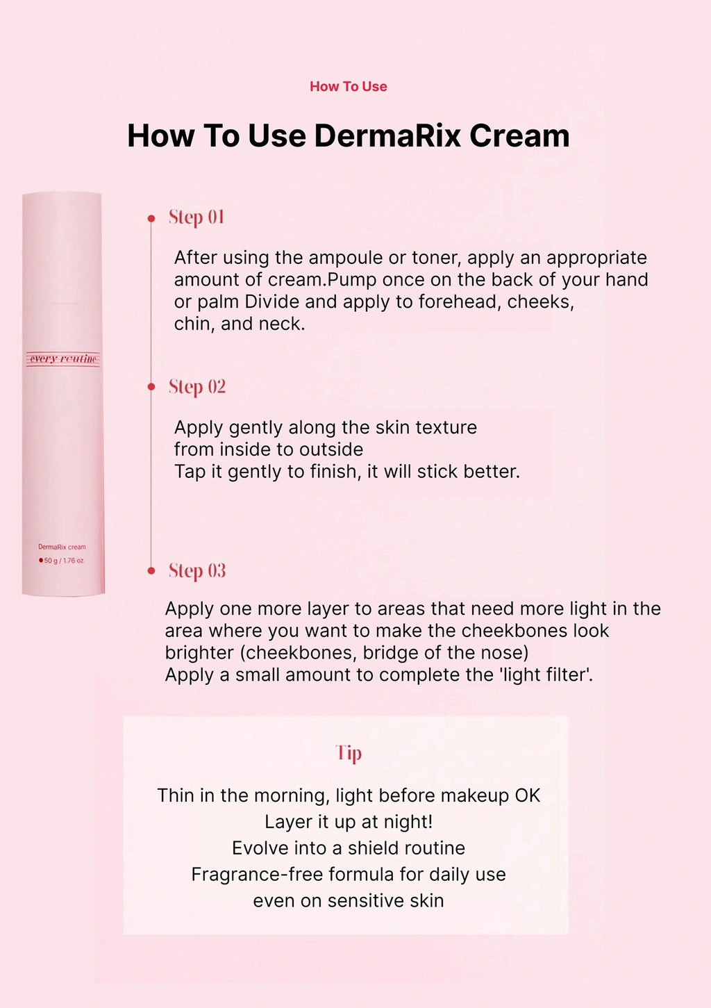 Every Routine DermaRix Cream is the final step in your skincare routine, acting as a protective shield that locks in moisture, strengthens the skin barrier, and leaves a clear, glowing finish reminiscent of glass skin. Powered by Radical Sponge®, a Nobel Prize-winning ingredient, it absorbs skin stress and provides potent antioxidant support.