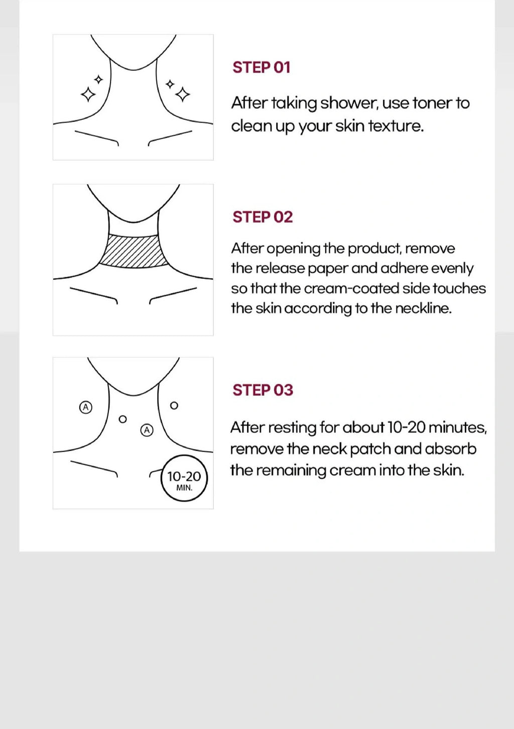 1. After showering, use a toner to refine your skin texture and ensure it is clean and ready for the neck patch application.